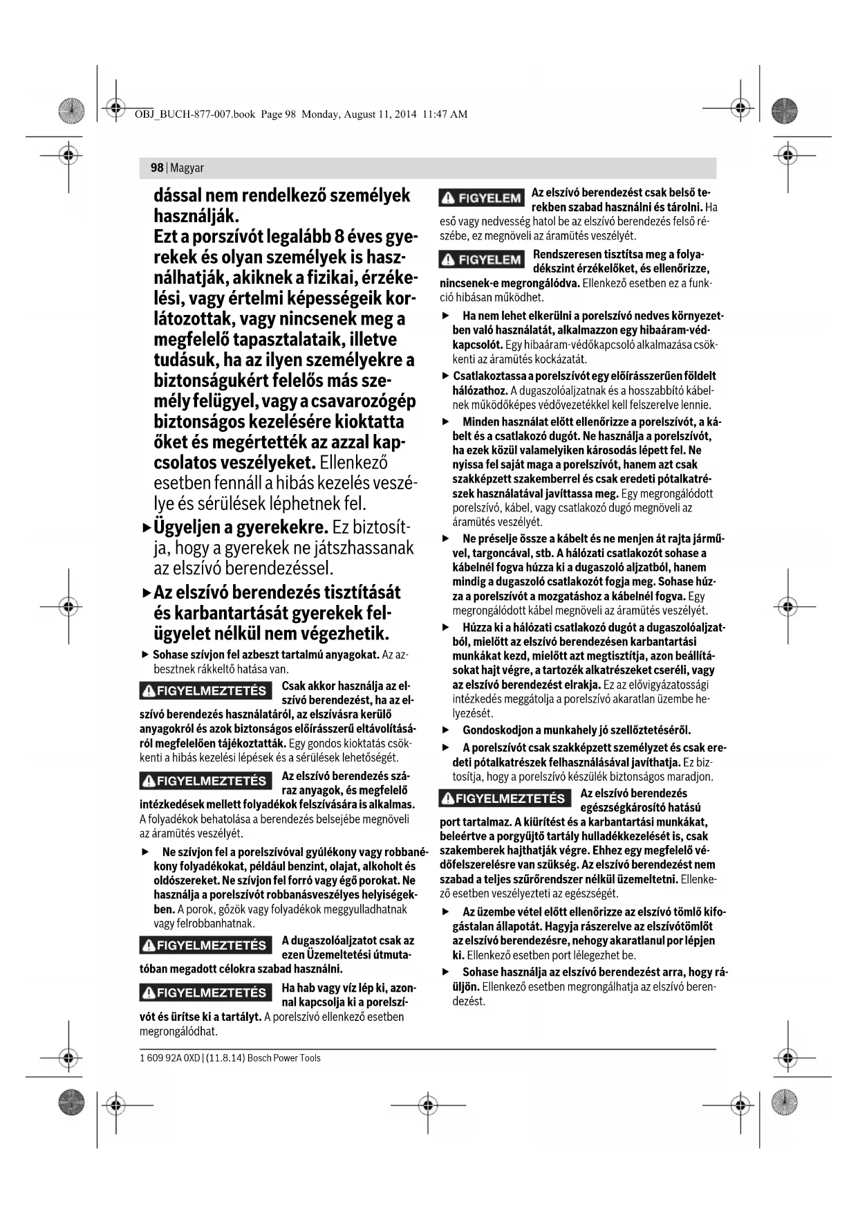 OBJ_BUCH-877-007.book Page 97 Monday, August 11, 2014 11:47 AM98 | Magyar 1 609 92A 0XD | (11.8.14) Bosch Power Tools dással nem rendelkező személyek