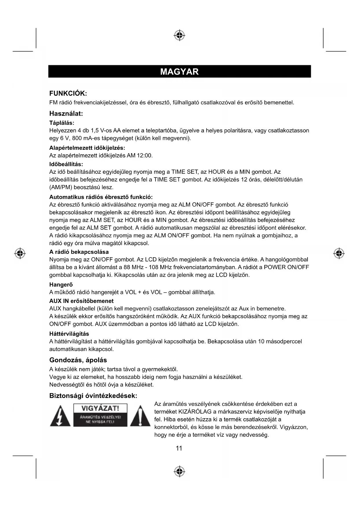 Nyomja meg az ON/OFF gombot. Az LCD kijelzön megjelenik a frekvencia értéke. A hangológombbal állítsa be a kívánt állomást a 88 MHz - 108 MHz frekvenciatartományban. A rádiót a POWER ON/OFF gombbal kapcsolhatja ki. Kikapcsolás után az óra jelenik meg az LCD kijelzön.