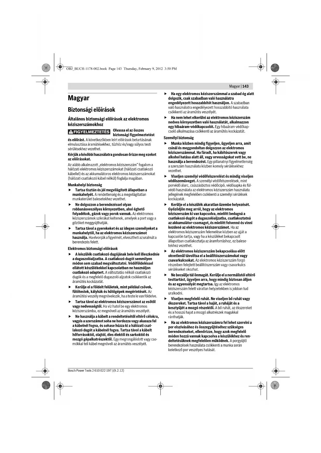 – Odsávací kryt 59 upevnite pomocou dvoch skrutiek 60 na základnú dosku 13. Odsávací kryt 59 sa dá upevniť v troch rozličných polohách, ako ukazuje obrázok. – Pri obrábaní hladkých rovinných plôch odsávací kryt opäť demontujte. Údržba a servis Údržba a čistenie f Pred každou prácou na ručnom elektrickom náradí vytiahnite zástrčku náradia zo zásuvky. f Ručné elektrické náradie a jeho vetracie štrbiny udržiavajte vždy v čistote, aby ste mohli pracovať kvalitne a bezpečne. f Pri používaní za extrémnych pracovných podmienok používajte podľa možnosti vždy odsávacie zariadenie. Vetracie štrbiny náradia častejšie prefúkajte a zapínajte ho cez ochranný spínač pri poruchových prúdoch (FI). Pri obrábaní kovov sa môže vnútri ručného elektrického náradia usádzať jemný dobre vodivý prach. To môže mať negatívny vplyv na ochrannú izoláciu ručného elektrického náradia. Ak je potrebná výmena prívodnej šnúry, musí ju vykonať firma Bosch alebo niektoré autorizované servisné stredisko ručného elektrického náradia Bosch, aby sa zabránilo ohrozeniu bezpečnosti používateľa náradia. Ak by prístroj napriek starostlivej výrobe a kontrole predsa len prestal niekedy fungovať, treba dať opravu vykonať autorizovanej servisnej opravovni elektrického náradia Bosch. Pri všetkých dopytoch a objednávkach náhradných súčiastok uvádzajte bezpodmienečne 10-miestne vecné číslo uvedené na typovom štítku výrobku. Servisné stredisko a poradenská služba pre zákazníkov Servisné stredisko Vám odpovie na otázky týkajúce sa opravy a údržby Vášho produktu ako aj náhradných súčiastok. Rozložené obrázky a informácie k náhradným súčiastkam nájdete aj na web-stránke: www.bosch-pt.com Tím poradenskej služby pre zákazníkov Bosch Vám rád pomôže aj pri problémoch týkajúcich sa kúpy a nastavenia produktov a príslušenstva. Slovakia Tel.: +421 (02) 48 703 800 Fax: +421 (02) 48 703 801 E-Mail: servis.naradia@sk.bosch.com www.bosch.sk Likvidácia Ručné elektrické náradie, príslušenstvo a obal treba dať na recykláciu šetriacu životné prostredie. Neodhadzujte ručné elektrické náradie do komunálneho odpadu! Len pre krajiny EÚ: Podľa Európskej smernice 2002/96/ES o starých elektrických a elektronických výrobkoch a podľa jej aplikácií v národnom práve sa musia už nepoužiteľné elektrické náradia zbierať separovane a treba ich dávať na recykláciu zodpovedajúcu ochrane životného prostredia. Zmeny vyhradené. OBJ_BUCH-1178-002.book Page 142 Thursday, February 9, 2012 3:50 PMMagyar | 143 Bosch Power Tools 2 610 022 197 | (9.2.12) Magyar Biztonsági előírások Általános biztonsági előírások az elektromos kéziszerszámokhoz Olvassa el az összes biztonsági figyelmeztetést és előírást. A következőkben leírt előírások betartásának elmulasztása áramütésekhez, tűzhöz és/vagy súlyos testi sérülésekhez vezethet. Kérjük a későbbi használatra gondosan őrizze meg ezeket az előírásokat. Az alább alkalmazott „elektromos kéziszerszám” fogalom a hálózati elektromos kéziszerszámokat (hálózati csatlakozó kábellel) és az akkumulátoros elektromos kéziszerszámokat (hálózati csatlakozó kábel nélkül) foglalja magában. Munkahelyi biztonság f Tartsa tisztán és jól megvilágított állapotban a munkahelyét. A rendetlenség és a megvilágítatlan munkaterület balesetekhez vezethet. f Ne dolgozzon a berendezéssel olyan robbanásveszélyes környezetben, ahol éghető folyadékok, gázok vagy porok vannak. Az elektromos kéziszerszámok szikrákat keltenek, amelyek a port vagy a gőzöket meggyújthatják. f Tartsa távol a gyerekeket és az idegen személyeket a munkahelytől, ha az elektromos kéziszerszámot használja. Ha elvonják a figyelmét, elvesztheti az uralmát a berendezés felett. Elektromos biztonsági előírások f A készülék csatlakozó dugójának bele kell illeszkednie a dugaszolóaljzatba. A csatlakozó dugót semmilyen módon sem szabad megváltoztatni. Védőföldeléssel ellátott készülékekkel kapcsolatban ne használjon csatlakozó adaptert. A változtatás nélküli csatlakozó dugók és a megfelelő dugaszoló aljzatok csökkentik az áramütés kockázatát. f Kerülje el a földelt felületek, mint például csövek, fűtőtestek, kályhák és hűtőgépek megérintését. Az áramütési veszély megnövekszik, ha a teste le van földelve. f Tartsa távol az elektromos kéziszerszámot az esőtől vagy nedvességtől. Ha víz hatol be egy elektromos kéziszerszámba, ez megnöveli az áramütés veszélyét. f Ne használja a kábelt a rendeltetésétől eltérő célokra, vagyis a szerszámot soha ne hordozza vagy akassza fel a kábelnél fogva, és sohase húzza ki a hálózati csat- lakozó dugót a kábelnél fogva. Tartsa távol a kábelt hőforrásoktól, olajtól, éles élektől és sarkoktól és mozgó gépalkatrészektől. Egy megrongálódott vagy cso- mókkal teli kábel megnöveli az áramütés veszélyét. f Ha egy elektromos kéziszerszámmal a szabad ég alatt dolgozik, csak szabadban való használatra engedélyezett hosszabbítót használjon. A szabadban való használatra engedélyezett hosszabbító használata csökkenti az áramütés veszélyét. f Ha nem lehet elkerülni az elektromos kéziszerszám nedves környezetben való használatát, alkalmazzon egy hibaáram-védőkapcsolót. Egy hibaáram-védőkap- csoló alkalmazása csökkenti az áramütés kockázatát. Személyi biztonság f Munka közben mindig figyeljen, ügyeljen arra, amit csinál és meggondoltan dolgozzon az elektromos kéziszerszámmal. Ha fáradt, ha kábítószerek vagy alkohol hatása alatt áll, vagy orvosságokat vett be, ne használja a berendezést. Egy pillanatnyi figyelmetlenség a szerszám használata közben komoly sérülésekhez vezethet. f Vis