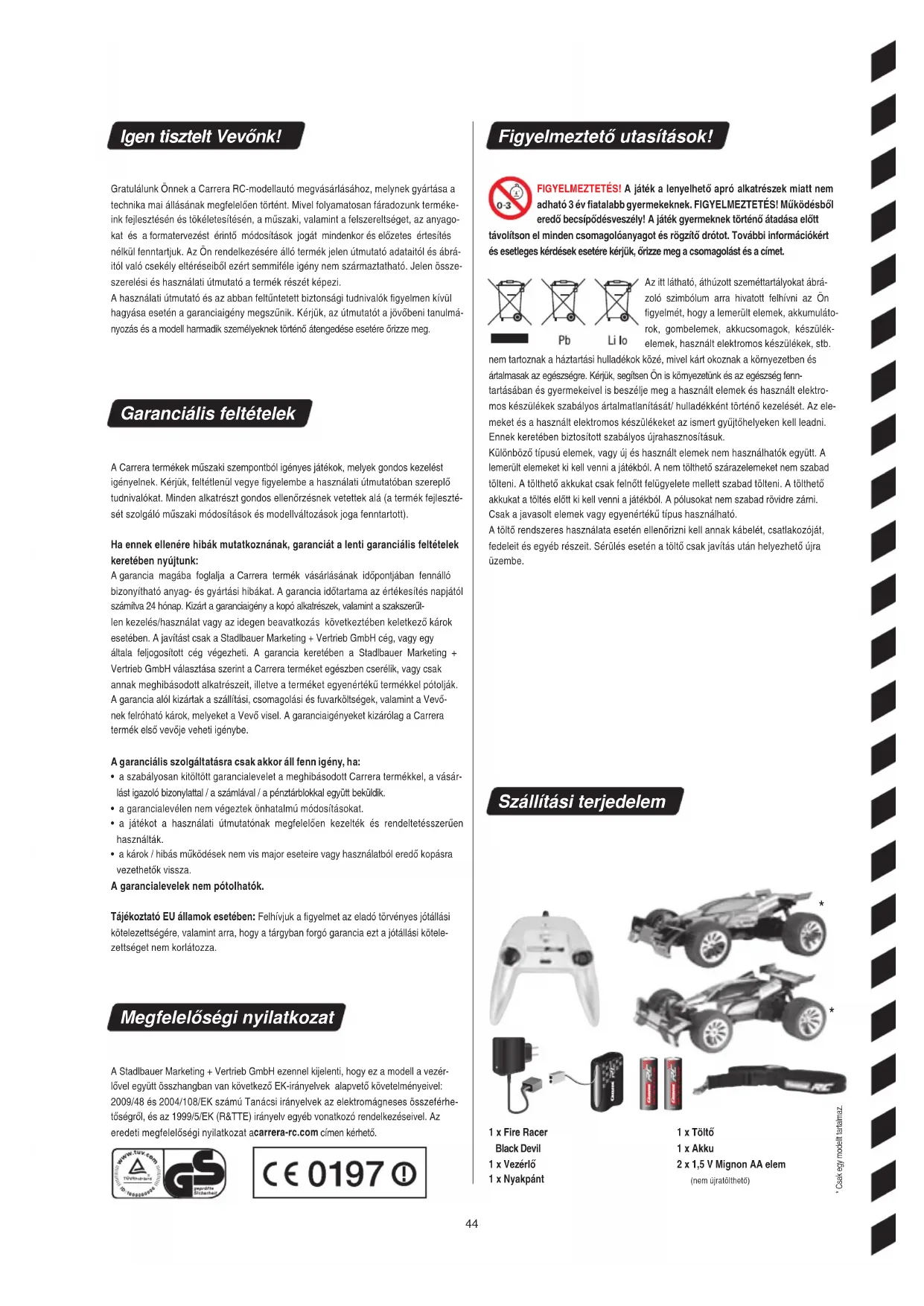 - Csak egy modellt tartalmaz. Igen tisztelt Vevőnk! Gratulálunk Önnek a Carrera RC-modellautó megvásárlásához, melynek gyártása a technika mai állásának megfelelően történt. Mivel folyamatosan fáradozunk terméke- ink fejlesztésén és tökéletesítésén, a műszaki, valamint a felszereltséget, az anyago- kat és a formatervezést érintő módosítások jogát mindenkor és előzetes értesítés nélkül fenntartjuk. Az Ön rendelkezésére álló termék jelen útmutató adataitól és ábrá- itól való csekély eltéréseiből ezért semmiféle igény nem származtatható. Jelen össze- szerelési és használati útmutató a termék részét képezi. A használati útmutató és az abban feltűntetett biztonsági tudnivalók figyelmen kívül hagyása esetén a garanciaigény megszűnik. Kérjük, az útmutatót a jövőbeni tanulmá- nyozás és a modell harmadik személyeknek történő átengedése esetére őrizze meg. Garanciális feltételek A Carrera termékek műszaki szempontból igényes játékok, melyek gondos kezelést igényelnek. Kérjük, feltétlenül vegye figyelembe a használati útmutatóban szereplő tudnivalókat. Minden alkatrészt gondos ellenőrzésnek vetettek alá (a termék fejleszté- sét szolgáló műszaki módosítások és modellváltozások joga fenntartott). Ha ennek ellenére hibák mutatkoznának, garanciát a lenti garanciális feltételek keretében nyújtunk: A garancia magába foglalja a Carrera termék vásárlásának időpontjában fennálló bizonyítható anyag- és gyártási hibákat. A garancia időtartama az értékesítés napjától számítva 24 hónap. Kizárt a garanciaigény a kopó alkatrészek, valamint a szakszerűt- len kezelés/használat vagy az idegen beavatkozás következtében keletkező károk esetében. A javítást csak a Stadlbauer Marketing + Vertrieb GmbH cég, vagy egy általa feljogosított cég végezheti. A garancia keretében a Stadlbauer Marketing + Vertrieb GmbH választása szerint a Carrera terméket egészben cserélik, vagy csak annak meghibásodott alkatrészeit, illetve a terméket egyenértékű termékkel pótolják. A garancia alól kizártak a szállítási, csomagolási és fuvarköltségek, valamint a Vevő- nek felróható károk, melyeket a Vevő visel. A garanciaigényeket kizárólag a Carrera termék első vevője veheti igénybe. A garanciális szolgáltatásra csak akkor ál l fenn igény, ha :