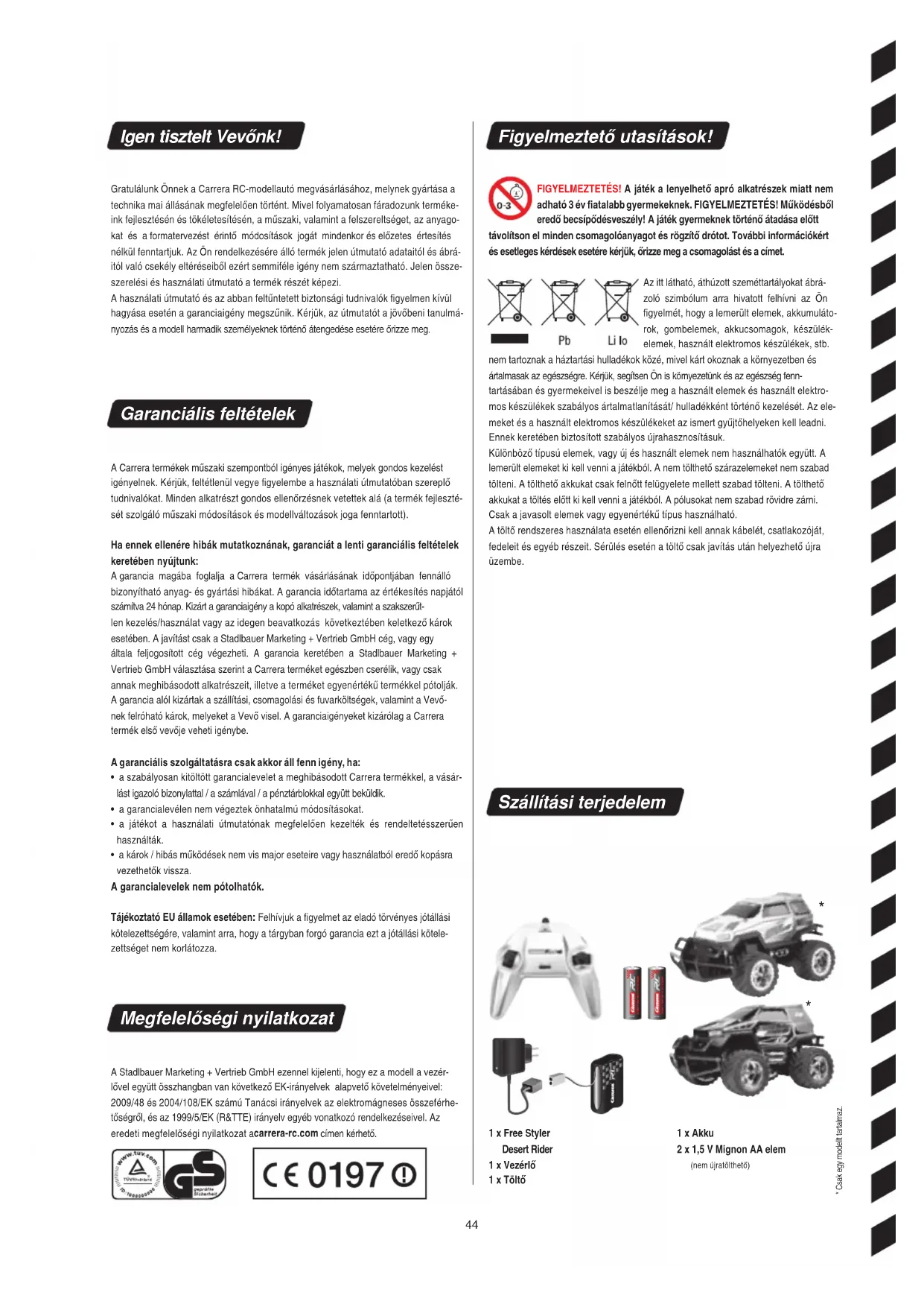 - Csak egy modellt tartalmaz. Igen tisztelt Vevőnk! Gratulálunk Önnek a Carrera RC-modellautó megvásárlásához, melynek gyártása a technika mai állásának megfelelően történt. Mivel folyamatosan fáradozunk terméke- ink fejlesztésén és tökéletesítésén, a műszaki, valamint a felszereltséget, az anyago- kat és a formatervezést érintő módosítások jogát mindenkor és előzetes értesítés nélkül fenntartjuk. Az Ön rendelkezésére álló termék jelen útmutató adataitól és ábrá- itól való csekély eltéréseiből ezért semmiféle igény nem származtatható. Jelen össze- szerelési és használati útmutató a termék részét képezi. A használati útmutató és az abban feltűntetett biztonsági tudnivalók figyelmen kívül hagyása esetén a garanciaigény megszűnik. Kérjük, az útmutatót a jövőbeni tanulmá- nyozás és a modell harmadik személyeknek történő átengedése esetére őrizze meg. Garanciális feltételek A Carrera termékek műszaki szempontból igényes játékok, melyek gondos kezelést igényelnek. Kérjük, feltétlenül vegye figyelembe a használati útmutatóban szereplő tudnivalókat. Minden alkatrészt gondos ellenőrzésnek vetettek alá (a termék fejleszté- sét szolgáló műszaki módosítások és modellváltozások joga fenntartott). Ha ennek ellenére hibák mutatkoznának, garanciát a lenti garanciális feltételek keretében nyújtunk: A garancia magába foglalja a Carrera termék vásárlásának időpontjában fennálló bizonyítható anyag- és gyártási hibákat. A garancia időtartama az értékesítés napjától számítva 24 hónap. Kizárt a garanciaigény a kopó alkatrészek, valamint a szakszerűt- len kezelés/használat vagy az idegen beavatkozás következtében keletkező károk esetében. A javítást csak a Stadlbauer Marketing + Vertrieb GmbH cég, vagy egy általa feljogosított cég végezheti. A garancia keretében a Stadlbauer Marketing + Vertrieb GmbH választása szerint a Carrera terméket egészben cserélik, vagy csak annak meghibásodott alkatrészeit, illetve a terméket egyenértékű termékkel pótolják. A garancia alól kizártak a szállítási, csomagolási és fuvarköltségek, valamint a Vevő- nek felróható károk, melyeket a Vevő visel. A garanciaigényeket kizárólag a Carrera termék első vevője veheti igénybe. A garanciális szolgáltatásra csak akkor ál l fenn igény, ha :