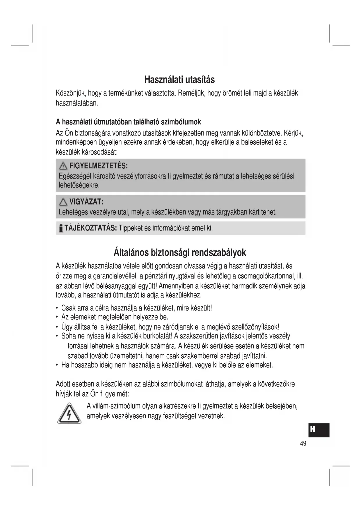 H Használati utasítás