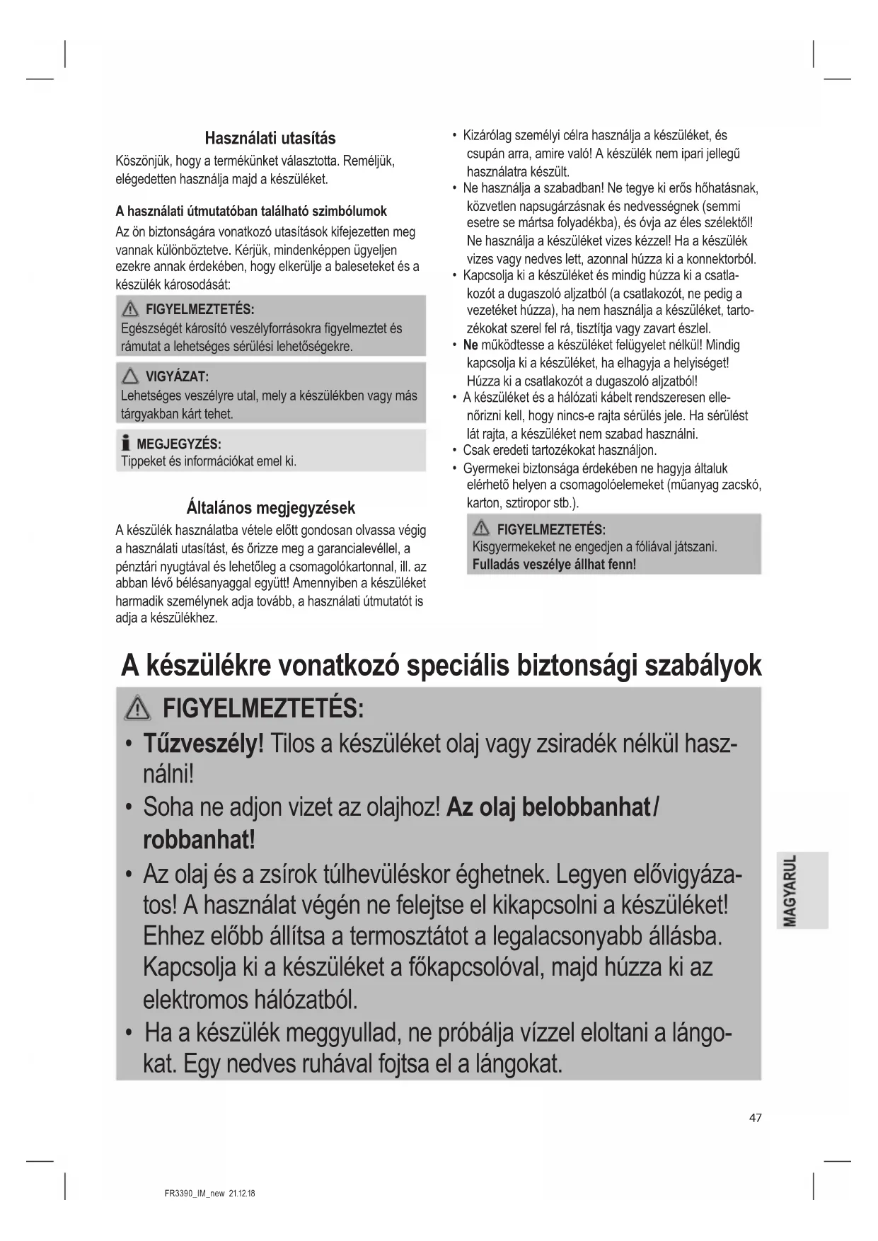 • Tűzveszély! Tilos a készüléket olaj vagy zsiradék nélkül hasz-