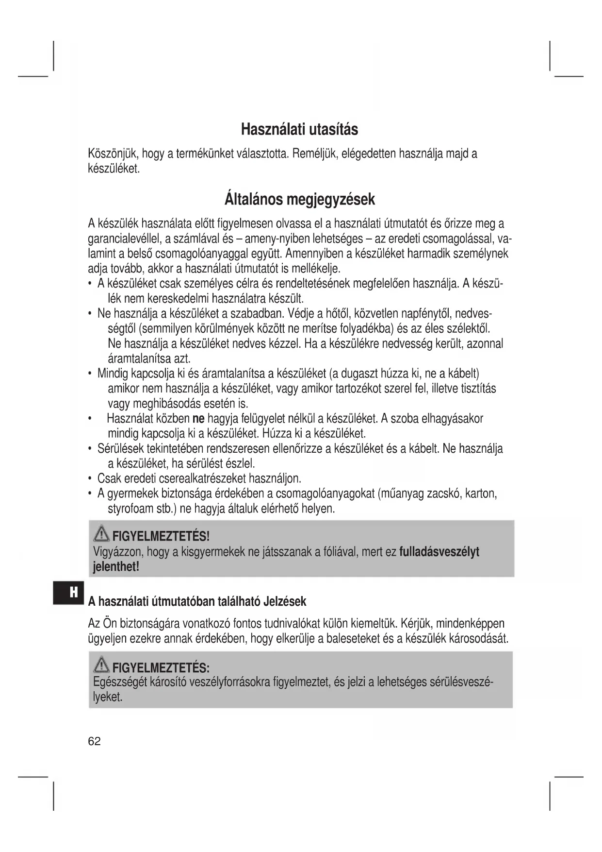 - A gyermekek biztonsága érdekében a csomagolóanyagokat (műanyag zacskó, karton, styrofoam stb.) ne hagyja általuk elérhető helyen. FIGYELMEZTETÉS! Vigyázzon, hogy a kisgyermekek ne játsszanak a fóliával, mert ez fulladásveszélyt jelenthet! A használati útmutatóban található Jelzések Az Ön biztonságára vonatkozó fontos tudnivalókat külön kiemeltük. Kérjük, mindenképpen ügyeljen ezekre annak érdekében, hogy elkerülje a baleseteket és a készülék károsodását. FIGYELMEZTETÉS: Egészségét károsító veszélyforrásokra gyelmeztet, és jelzi a lehetséges sérülésveszé- lyeket.63