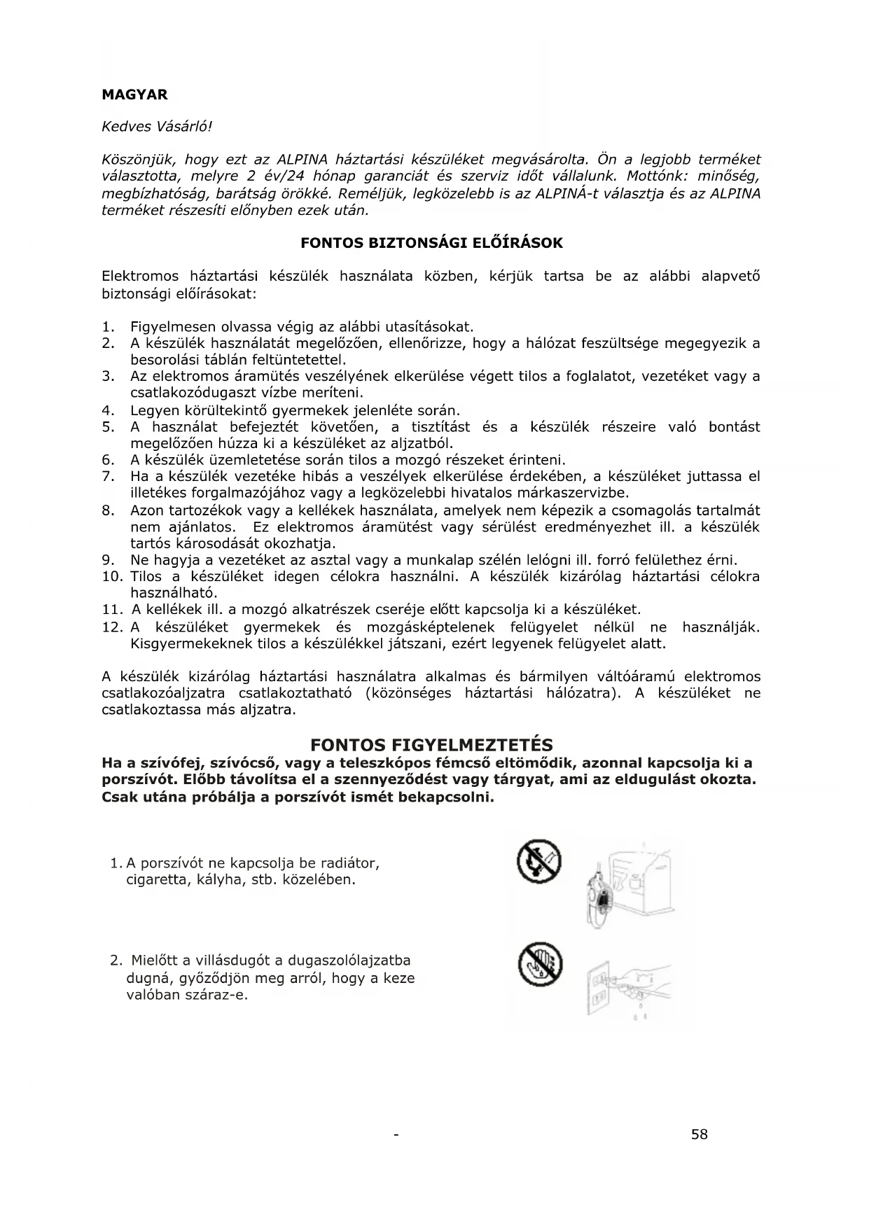 Kedves Vásárló! Köszönjük, hogy ezt az ALPINA háztartási készüléket megvásárolta. Ön a legjobb terméket választotta, melyre 2 év/24 hónap garanciát és szerviz időt vállalunk. Mottónk: minőség, megbízhatóság, barátság örökké. Reméljük, legközelebb is az ALPINÁ-t választja és az ALPINA terméket részesíti előnyben ezek után.