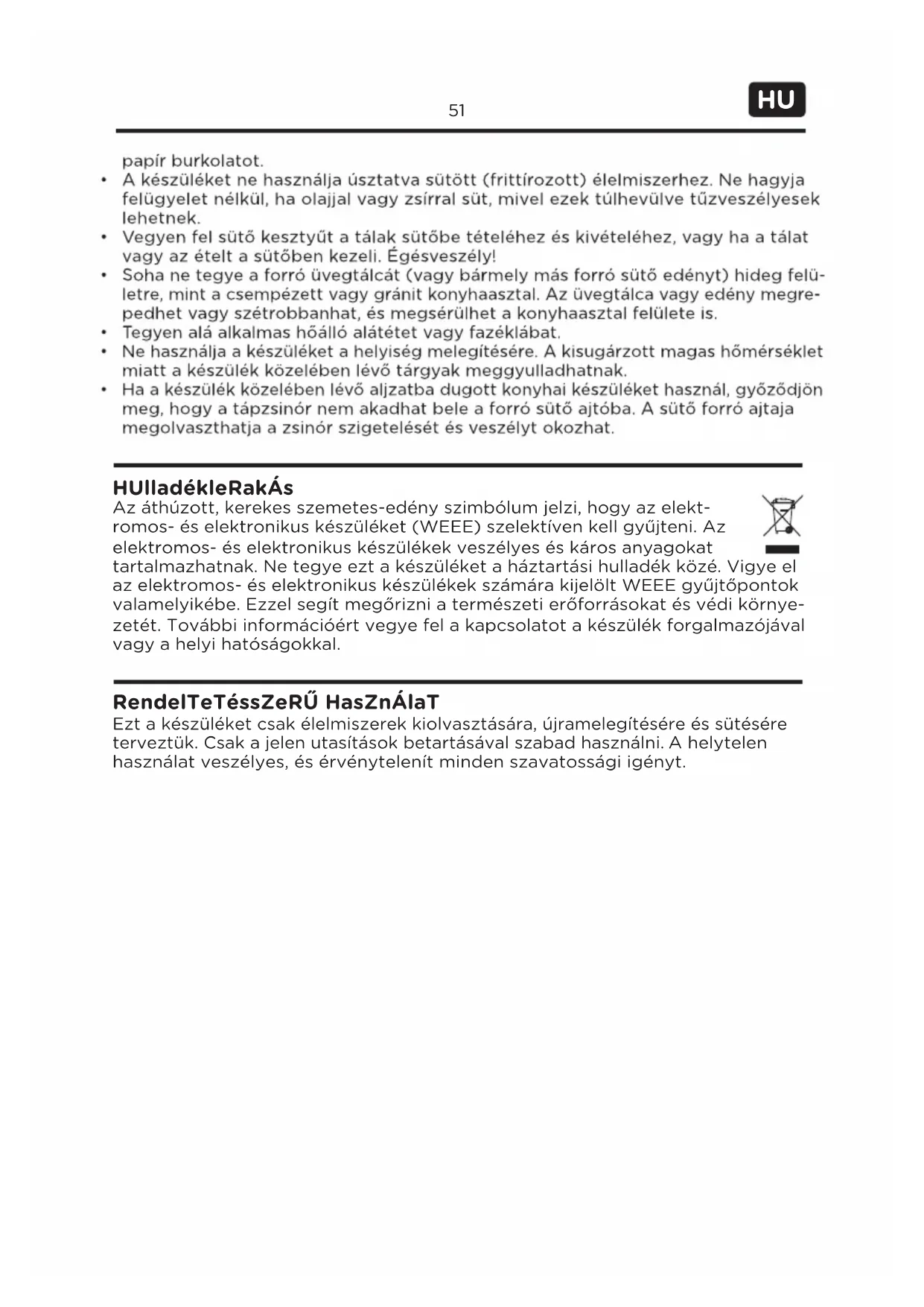 Az áthúzott, kerekes szemetes-edény szimbólum jelzi, hogy az elekt- romos- és elektronikus készüléket (WEEE) szelektíven kell gyűjteni. Az elektromos- és elektronikus készülékek veszélyes és káros anyagokat tartalmazhatnak. Ne tegye ezt a készüléket a háztartási hulladék közé. Vigye el az elektromos- és elektronikus készülékek számára kijelölt WEEE gyűjtőpontok valamelyikébe. Ezzel segít megőrizni a természeti erőforrásokat és védi környe- zetét. További információért vegye fel a kapcsolatot a készülék forgalmazójával vagy a helyi hatóságokkal. HUlladékleRakás Ezt a készüléket csak élelmiszerek kiolvasztására, újramelegítésére és sütésére terveztük. Csak a jelen utasítások betartásával szabad használni. A helytelen használat veszélyes, és érvénytelenít minden szavatossági igényt. RendelTeTéssZeRŰ HasZnálaT52