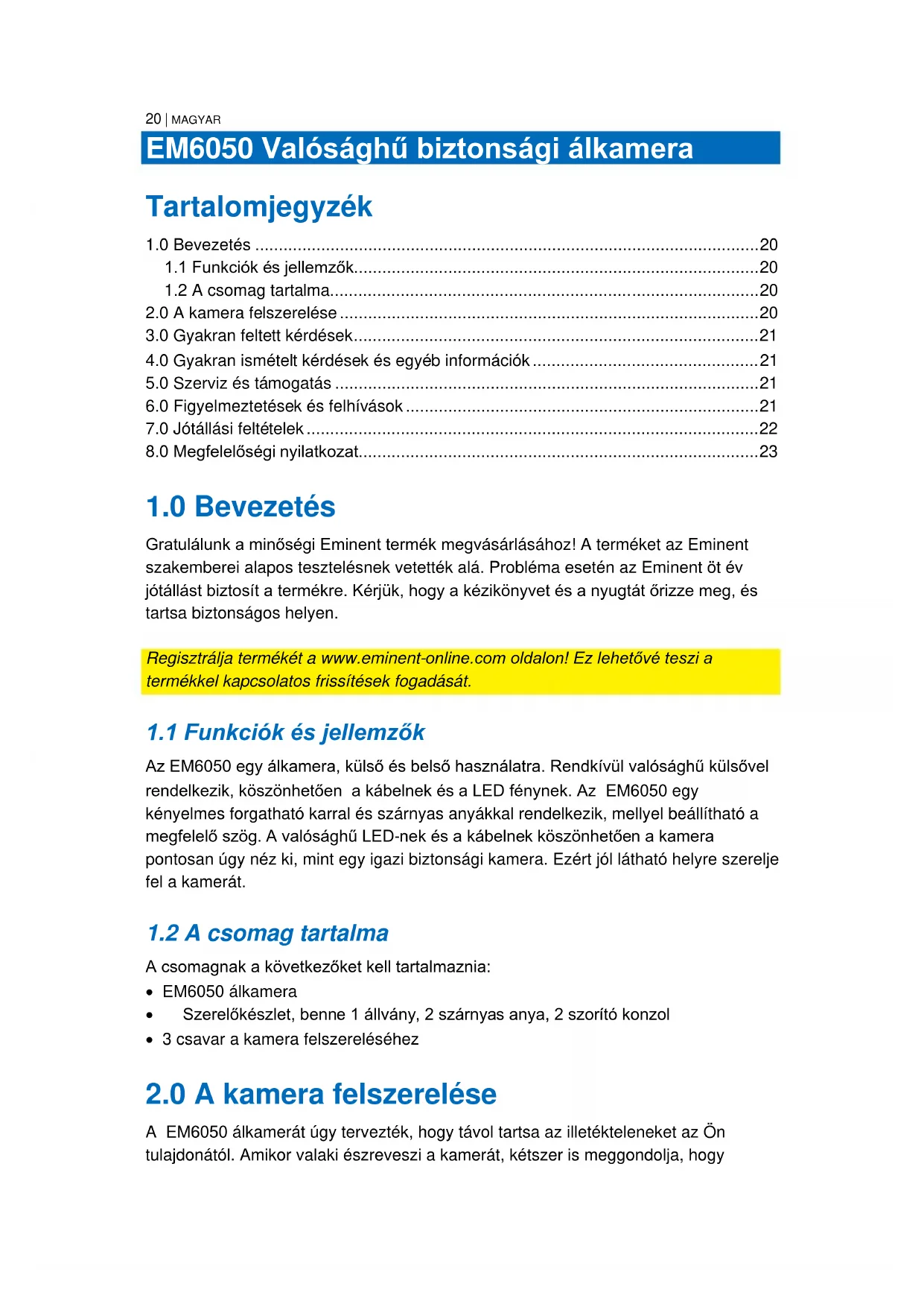 Gratulálunk a minőségi Eminent termék megvásárlásához! A terméket az Eminent szakemberei alapos tesztelésnek vetették alá. Probléma esetén az Eminent öt év jótállást biztosít a termékre. Kérjük, hogy a kézikönyvet és a nyugtát őrizze meg, és tartsa biztonságos helyen. Regisztrálja termékét a www.eminent-online.com oldalon! Ez lehetővé teszi a termékkel kapcsolatos frissítések fogadását.