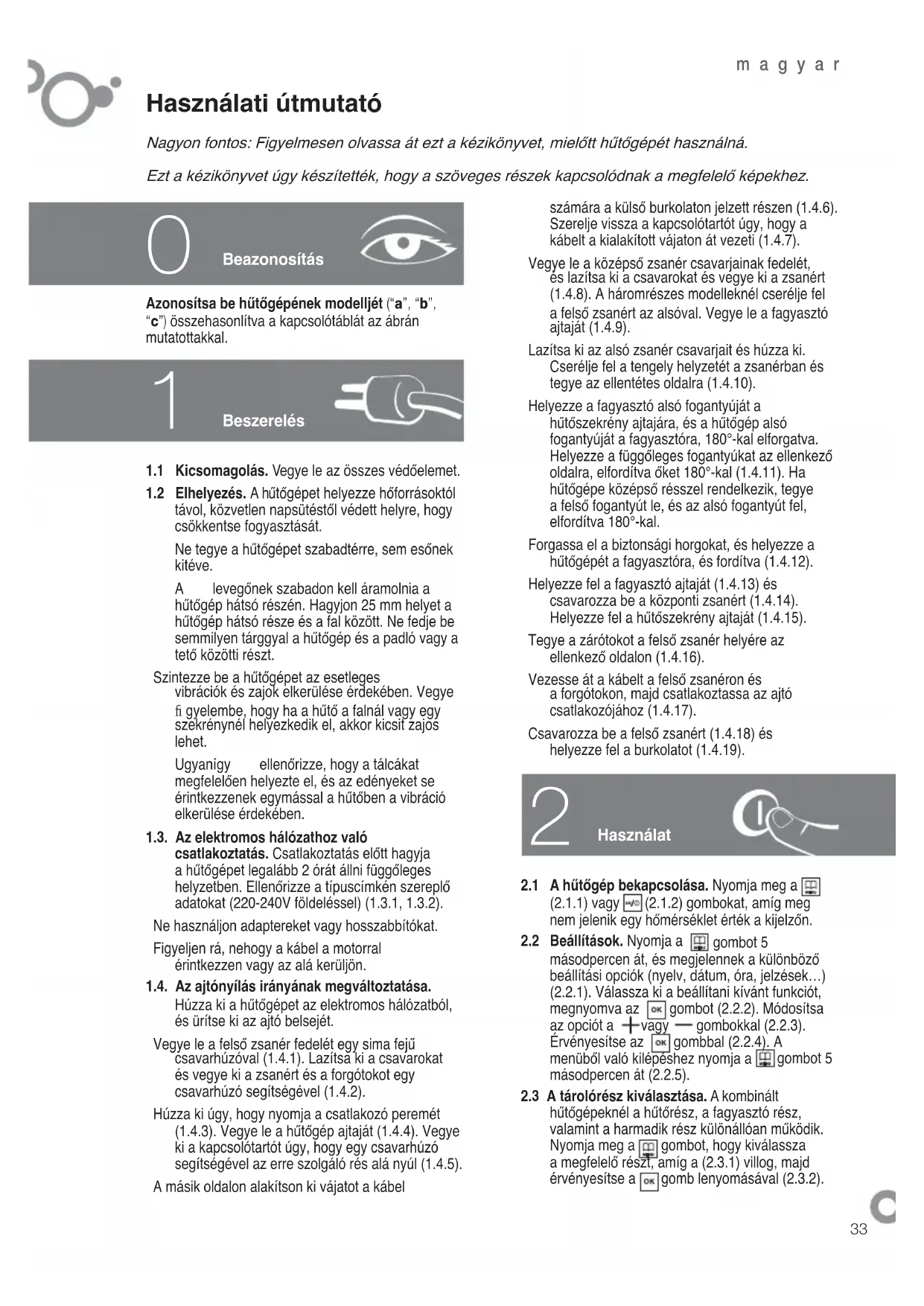 távol, közvetlen napsütéstől védett helyre, hogy csökkentse fogyasztását. Ne tegye a hűtőgépet szabadtérre, sem esőnek kitéve. A levegőnek szabadon kell áramolnia a hűtőgép hátsó részén. Hagyjon 25 mm helyet a hűtőgép hátsó része és a fal között. Ne fedje be semmilyen tárggyal a hűtőgép és a padló vagy a tető közötti részt. Szintezze be a hűtőgépet az esetleges vibrációk és zajok elkerülése érdekében. Vegye fi gyelembe, hogy ha a hűtő a falnál vagy egy szekrénynél helyezkedik el, akkor kicsit zajos lehet. Ugyanígy ellenőrizze, hogy a tálcákat megfelelően helyezte el, és az edényeket se érintkezzenek egymással a hűtőben a vibráció elkerülése érdekében.1.3. Az elektromos hálózathoz való csatlakoztatás. Csatlakoztatás előtt hagyja a hűtőgépet legalább 2 órát állni függőleges helyzetben. Ellenőrizze a típuscímkén szereplő adatokat (220-240V földeléssel) (1.3.1, 1.3.2). Ne használjon adaptereket vagy hosszabbítókat. Figyeljen rá, nehogy a kábel a motorral érintkezzen vagy az alá kerüljön.1.4. Az ajtónyílás irányának megváltoztatása. Húzza ki a hűtőgépet az elektromos hálózatból, és ürítse ki az ajtó belsejét. Vegye le a felső zsanér fedelét egy sima fejű csavarhúzóval (1.4.1). Lazítsa ki a csavarokat és vegye ki a zsanért és a forgótokot egy csavarhúzó segítségével (1.4.2). Húzza ki úgy, hogy nyomja a csatlakozó peremét (1.4.3). Vegye le a hűtőgép ajtaját (1.4.4). Vegye ki a kapcsolótartót úgy, hogy egy csavarhúzó segítségével az erre szolgáló rés alá nyúl (1.4.5). A másik oldalon alakítson ki vájatot a kábel
