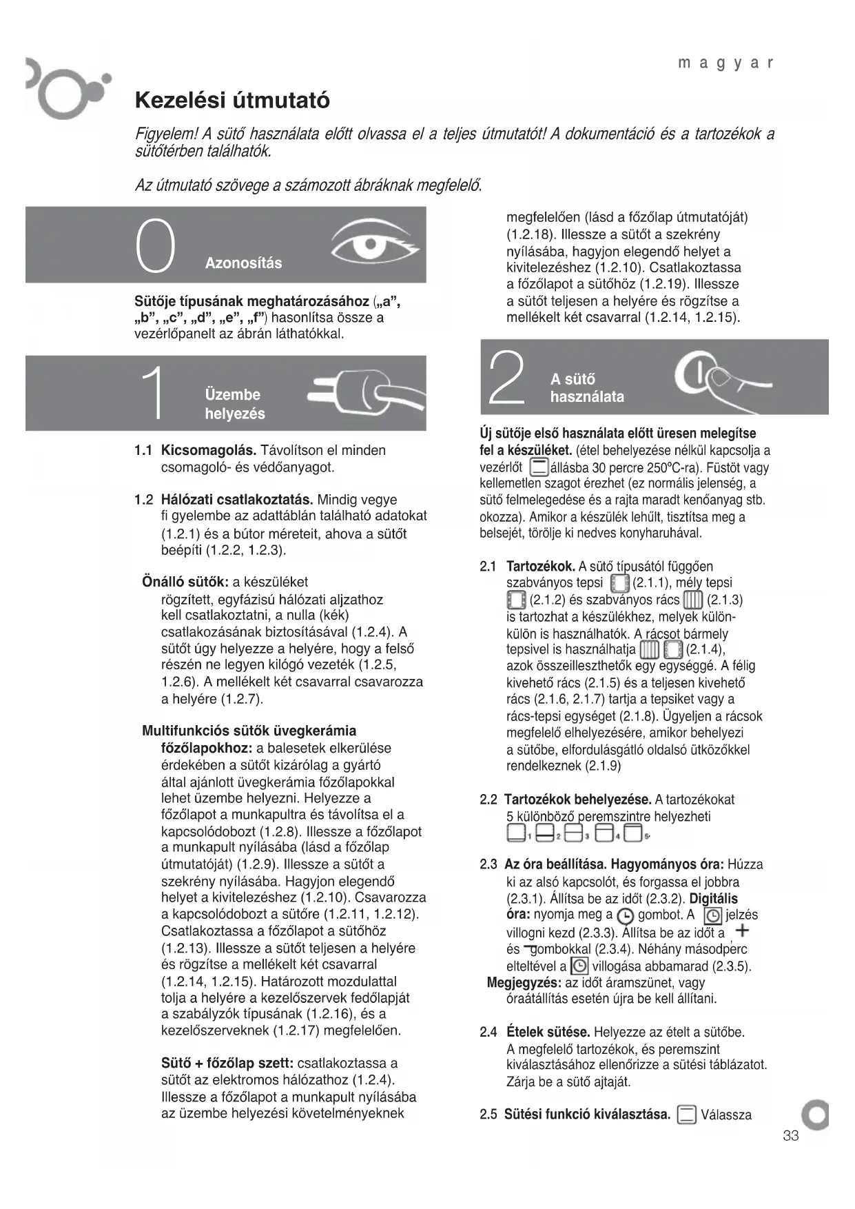 Sütője típusának meghatározásához („a”, „b”, „c”, „d”, „e”, „f”) hasonlítsa össze a vezérlőpanelt az ábrán láthatókkal.1.1 Kicsomagolás. Távolítson el minden csomagoló- és védőanyagot.1.2 Hálózati csatlakoztatás. Mindig vegye fi gyelembe az adattáblán található adatokat (1.2.1) és a bútor méreteit, ahova a sütőt beépíti (1.2.2, 1.2.3). Önálló sütők: a készüléket rögzített, egyfázisú hálózati aljzathoz kell csatlakoztatni, a nulla (kék) csatlakozásának biztosításával (1.2.4). A sütőt úgy helyezze a helyére, hogy a felső részén ne legyen kilógó vezeték (1.2.5, 1.2.6). A mellékelt két csavarral csavarozza a helyére (1.2.7). Multifunkciós sütők üvegkerámia főzőlapokhoz: a balesetek elkerülése érdekében a sütőt kizárólag a gyártó által ajánlott üvegkerámia főzőlapokkal lehet üzembe helyezni. Helyezze a főzőlapot a munkapultra és távolítsa el a kapcsolódobozt (1.2.8). Illessze a főzőlapot a munkapult nyílásába (lásd a főzőlap útmutatóját) (1.2.9). Illessze a sütőt a szekrény nyílásába. Hagyjon elegendő helyet a kivitelezéshez (1.2.10). Csavarozza a kapcsolódobozt a sütőre (1.2.11, 1.2.12). Csatlakoztassa a főzőlapot a sütőhöz (1.2.13). Illessze a sütőt teljesen a helyére és rögzítse a mellékelt két csavarral (1.2.14, 1.2.15). Határozott mozdulattal tolja a helyére a kezelőszervek fedőlapját a szabályzók típusának (1.2.16), és a kezelőszerveknek (1.2.17) megfelelően.