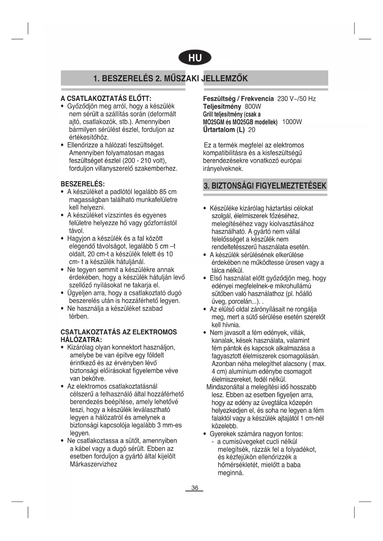 1. BESZERELÉS 2. MŰSZAKI JELLEMZŐK Feszültség / Frekvencia 230 V~/50 Hz