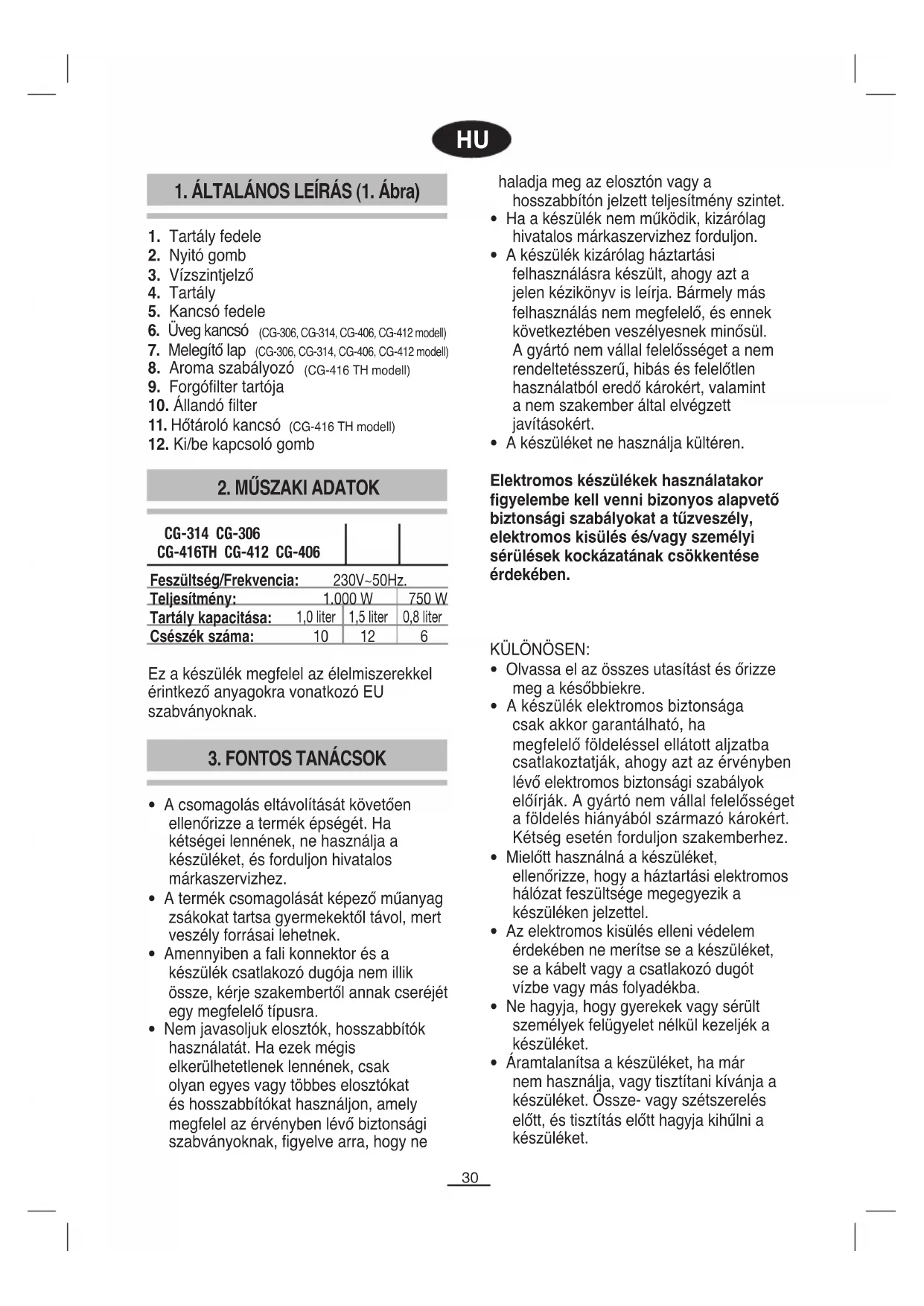 - Áramtalanítsa a készüléket, ha már nem használja, vagy tisztítani kívánja a készüléket. Össze- vagy szétszerelés előtt, és tisztítás előtt hagyja kihűlni a készüléket. CG-314 CG-306 CG-416TH CG-412 CG-406 Feszültség/Frekvencia: 230V~50Hz. Teljesítmény: 1.000W 750W Tartály kapacitása: 1,0liter 1,5liter 0,8liter Csészék száma: 10 12 631