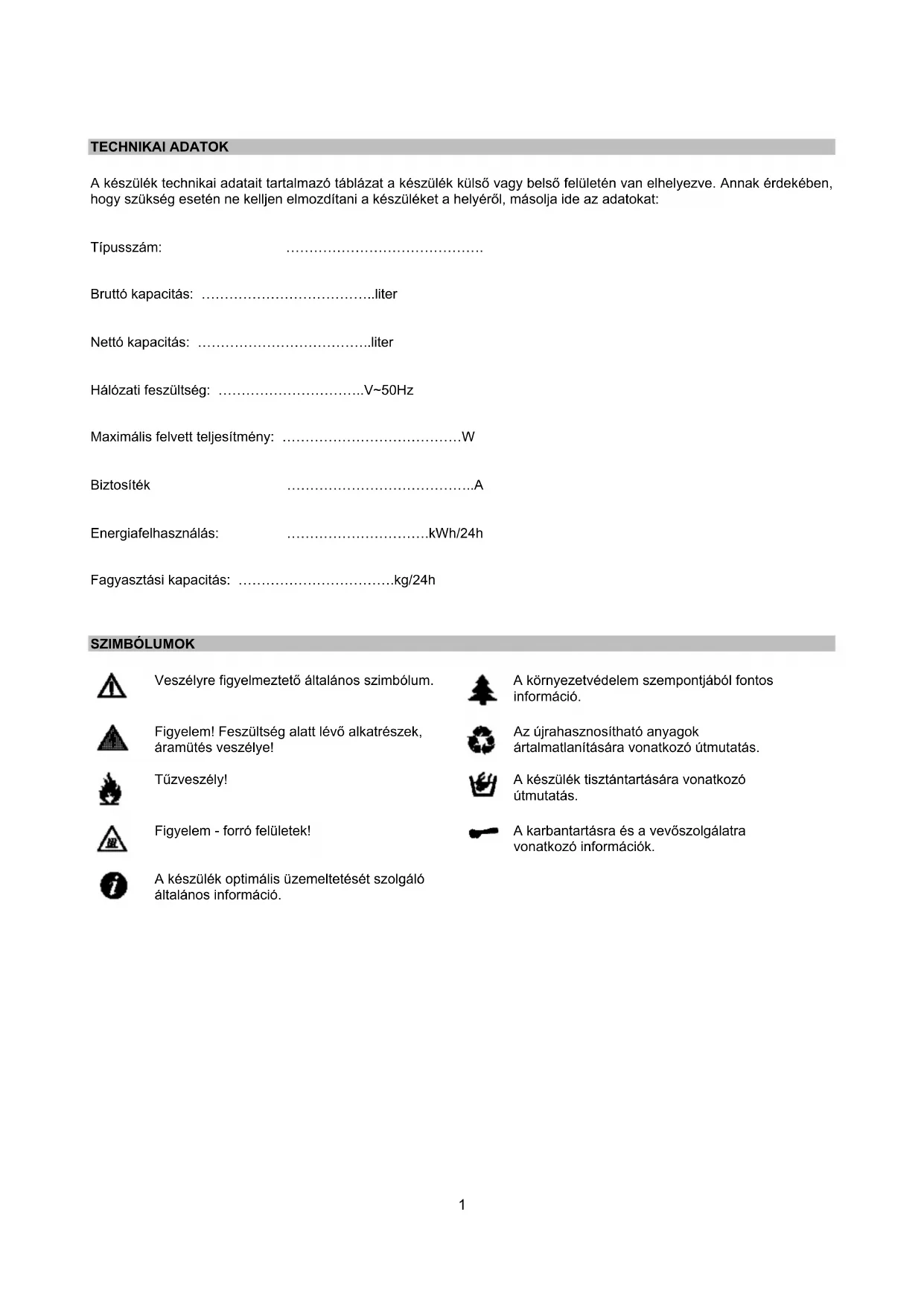 Maximális felvett teljesítmény: …………………………………W Biztosíték …………………………………..A Energiafelhasználás: ………………………….kWh/24h
