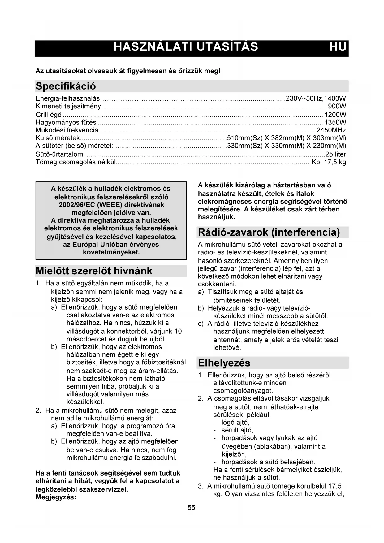 kg. Olyan vízszintes felületen helyezzük el, A készülék a hulladék elektromos és elektronikus felszerelésekről szóló 2002/96/EC (WEEE) direktívának megfelelően jelölve van. A direktíva meghatározza a hulladék elektromos és elektronikus felszerelések gyűjtésével és kezelésével kapcsolatos, az Európai Unióban érvényes követelményeket.56 amely elég erős ahhoz, hogy megtartsa a sütőt.