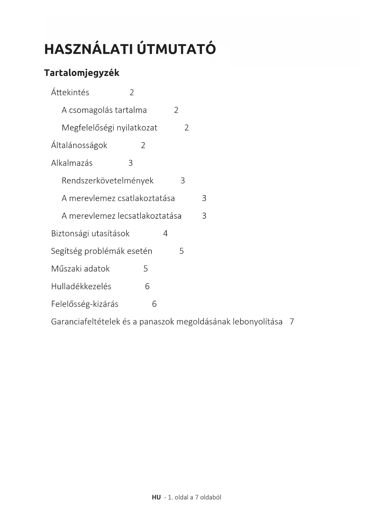 Agyermekekgyakranalábecsülikaveszélyeketvagyegyáltalánnemismerikfelőket.Jelen terméketnemarratervezték,hogyolyanszemélyekhasználják,akiknekkorlátozoérzékelési, zikaivagyszellemiképességeikvannakvagynincstapasztalatukakészülékkezelésében,és/vagy nemismerikakészüléket,hacsakakészülékhasználataközbennemfelügyeliőketegyolyan személy,akifelelősabiztonságukértvagyutasításokkallátjaelőketakészülékhasználatát tekintőenésmegérkahasználatbólkeletkezőveszélyeket.Agyermekekfelügyeletnélkülnem nyúlhatnakakészülékhez.Gondoskodjonarról,hogyagyermekeknemjátszanakakészülékkel. Veszélyek gyermekek és korlátozott zikai, érzékelési vagy szellemi képességű személyek számára:HU -5.oldala7oldaból SEGÍTSÉG PROBLÉMÁK ESETÉN EllenőrizzeazkészülékkülsőmerevlemeztésazUSBkábeltészlelhetősérülésektekintetében.Ha ezfennáll,kérjük,forduljonaműszakiügyfélszolgálatunkhoz,hogyaztkicseréljék.Semmiképpne használjonmeghibásodokészüléketvagykábelt. Ellenőrizze,hogyakábelcsatlakoztatásamegfelelőentörtént. Az állapotjelző led nem világít Előszörellenőrizze„Azállapotjelzőlednemvilágít“c.alfejezetpontjait. KérjükellenőrizzeakészülékeösszestovábbiUSBcsatlakozóit(leginkábbahátoldalonlevőketa számítógépeknél),esetlegesenamerevlemeztúlkevésáramotkapahasználtUSBcsatlakozónál. Kérjük,használjacsakamellékeltkábeltéskülönösennehasználjonhosszabbítót. HaegyátalakítóUSBhubotalkalmazamerevlemezésaszámítógépközö,akkorannaksaját áramellátássalkellrendelkeznie. HaamerevlemezakészülékeegyetlenUSBcsatlakozójávalsemkerülfelismerésre,próbáljameg, hogyműködik-eegymásikkészüléken,hogykizárhassonegyesetlegesmeghibásodást. Ellenőrizzeazadathordozókadminisztrálását,esetlegcsakegymeghajtóbetűjeltkellalárendelni (részleteketazoperációsrendszerszolgáltatójánakSúgófájljábantalál). HapéldáulelőszöregyTVkészülékkelhasználtaamerevlemezt,megtörténhet,hogyelőbb formatálniakellamerevlemezt,hogyaztújraegyszámítógépenhasználhassa(részleteketaz előzőleghasználtkészülékhasználaútmutatójábanés/vagyazoperációsrendszer szolgáltatójánakSúgófájljábantalál). A készülék nem ismeri fel a merevlemezt