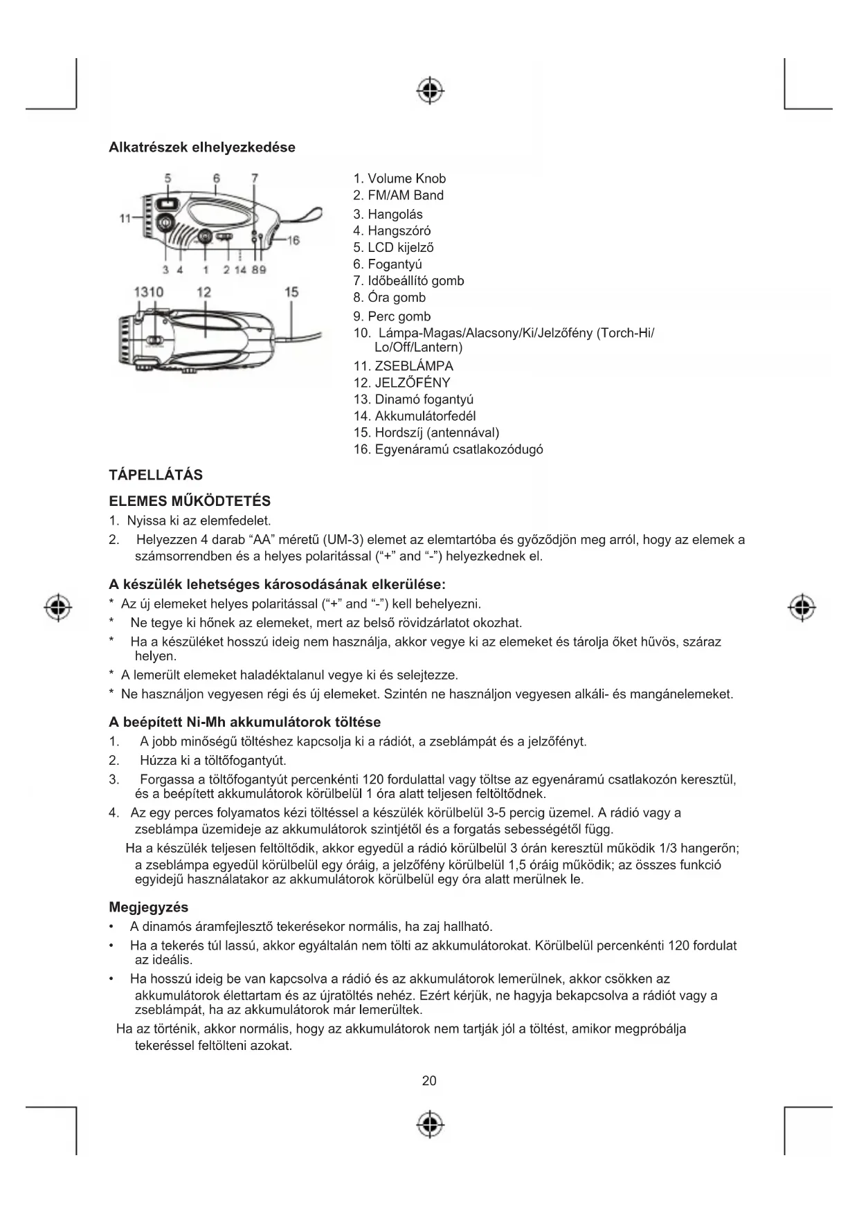 zseblámpaüzemidejeazakkumulátorokszintjétőlésaforgatássebességétőlfügg. Haakészülékteljesenfeltöltődik,akkoregyedülarádiókörülbelül3óránkeresztülműködik1/3hangerőn; azseblámpaegyedülkörülbelülegyóráig,ajelzőfénykörülbelül1,5óráigműködik;azösszesfunkció egyidejűhasználatakorazakkumulátorokkörülbelülegyóraalattmerülnekle. Megjegyzés