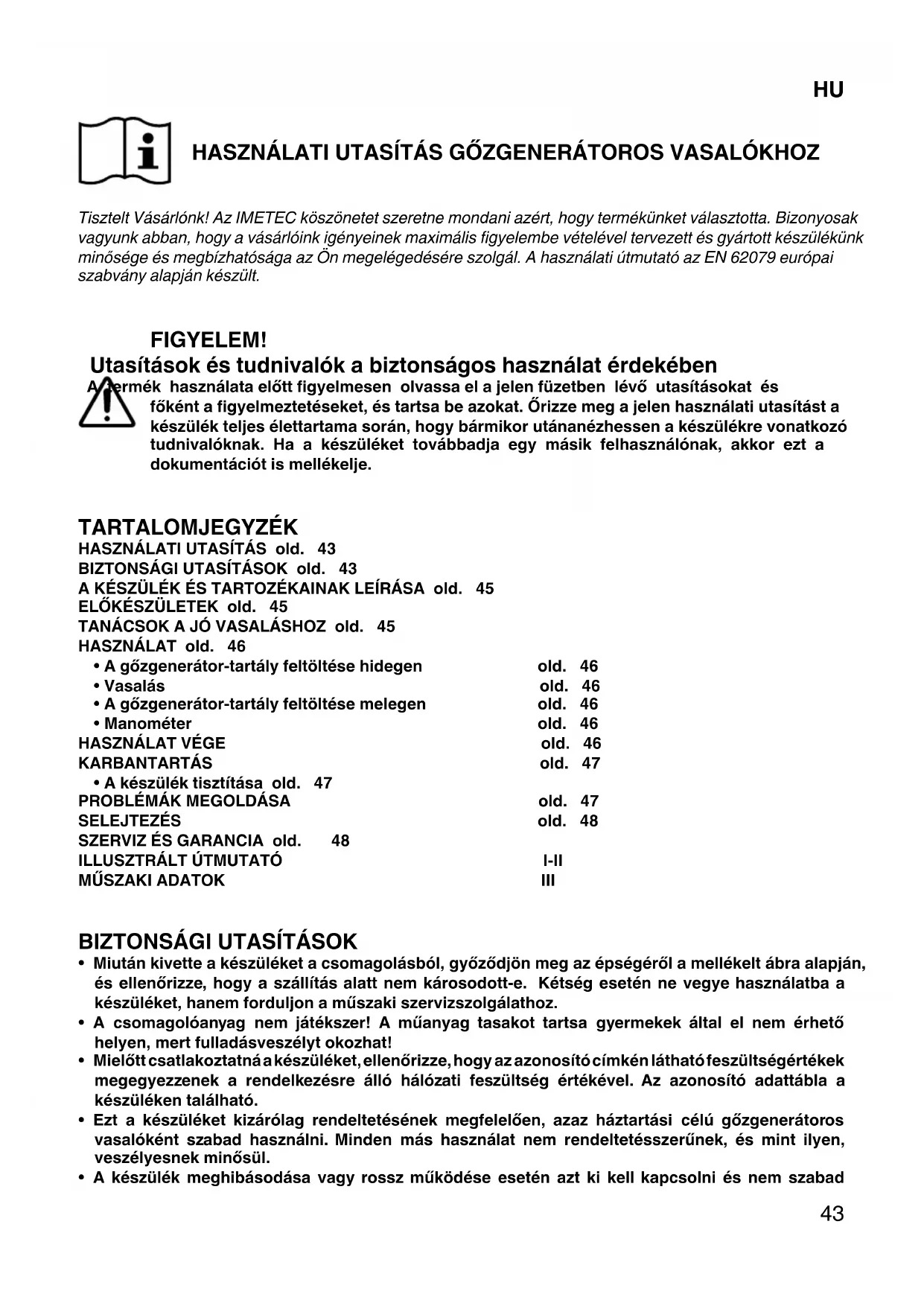 HU HASZNÁLATI UTASÍTÁS GŐZGENERÁTOROS VASALÓKHOZ Tisztelt Vásárlónk! Az IMETEC köszönetet szeretne mondani azért, hogy termékünket választotta. Bizonyosak