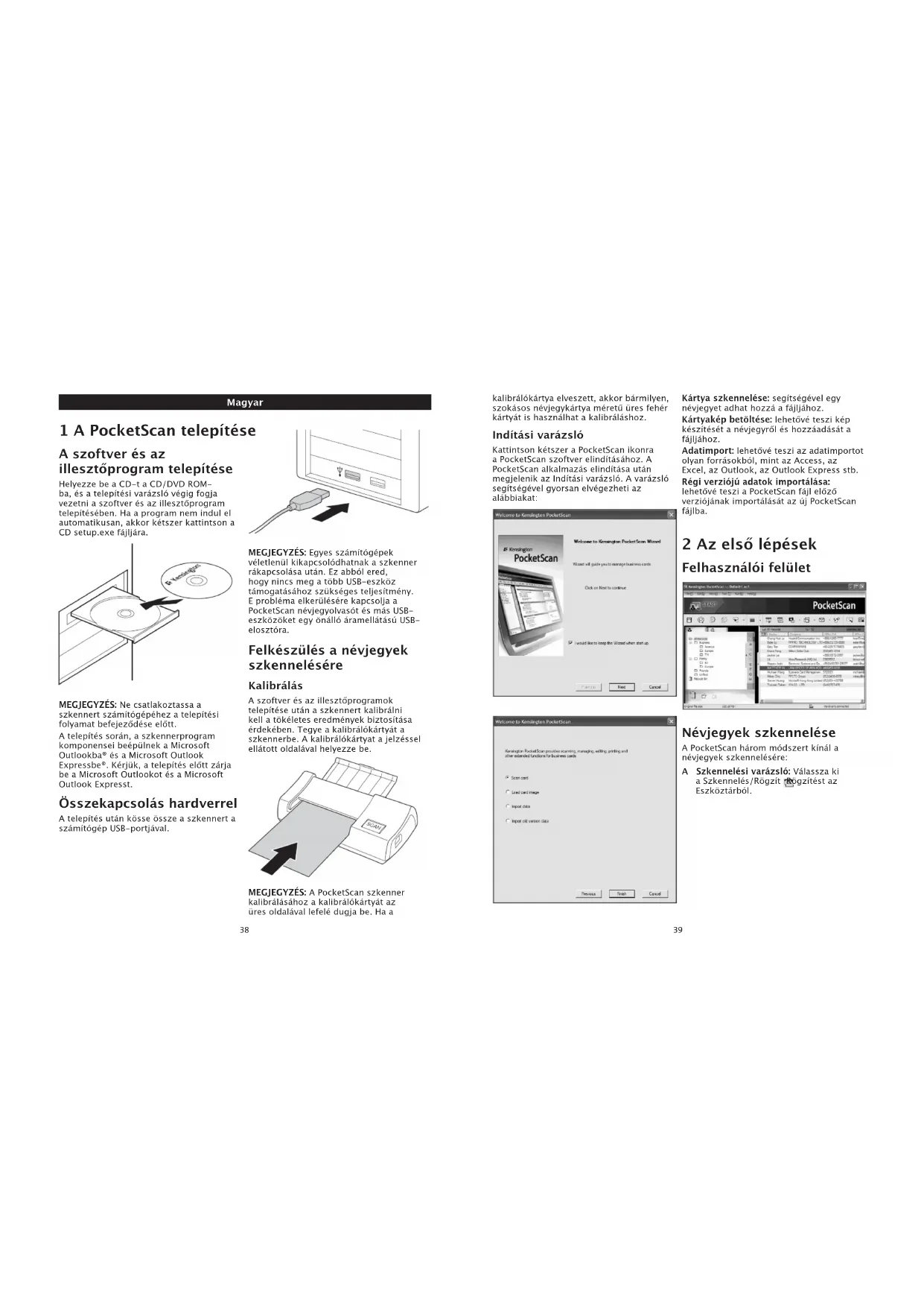 1 A PocketScan telepítése A szoftver és az illesztőprogram telepítése Helyezze be a CD-t a CD/DVD ROM- ba, és a telepítési varázsló végig fogja vezetni a szoftver és az illesztőprogram telepítésében. Ha a program nem indul el automatikusan, akkor kétszer kattintson a CD setup.exe fájljára. MEGJEGYZÉS: Ne csatlakoztassa a szkennert számítógépéhez a telepítési folyamat befejeződése előtt. A telepítés során, a szkennerprogram komponensei beépülnek a Microsoft Outlookba® és a Microsoft Outlook Expressbe®. Kérjük, a telepítés előtt zárja be a Microsoft Outlookot és a Microsoft Outlook Expresst. Összekapcsolás hardverrel A telepítés után kösse össze a szkennert a számítógép USB-portjával. MEGJEGYZÉS: Egyes számítógépek véletlenül kikapcsolódhatnak a szkenner rákapcsolása után. Ez abból ered, hogy nincs meg a több USB-eszköz támogatásához szükséges teljesítmény. E probléma elkerülésére kapcsolja a PocketScan névjegyolvasót és más USB- eszközöket egy önálló áramellátású USB- elosztóra. Felkészülés a névjegyek szkennelésére Kalibrálás A szoftver és az illesztőprogramok telepítése után a szkennert kalibrálni kell a tökéletes eredmények biztosítása érdekében. Tegye a kalibrálókártyát a szkennerbe. A kalibrálókártyat a jelzéssel ellátott oldalával helyezze be. MEGJEGYZÉS: A PocketScan szkenner kalibrálásához a kalibrálókártyát az üres oldalával lefelé dugja be. Ha a Magyar kalibrálókártya elveszett, akkor bármilyen, szokásos névjegykártya méretű üres fehér kártyát is használhat a kalibráláshoz. Indítási varázsló Kattintson kétszer a PocketScan ikonra a PocketScan szoftver elindításához. A PocketScan alkalmazás elindítása után megjelenik az Indítási varázsló. A varázsló segítségével gyorsan elvégezheti az alábbiakat: Kártya szkennelése: segítségével egy névjegyet adhat hozzá a fájljához. Kártyakép betöltése: lehetővé teszi kép készítését a névjegyről és hozzáadását a fájljához. Adatimport: lehetővé teszi az adatimportot olyan forrásokból, mint az Access, az Excel, az Outlook, az Outlook Express stb. Régi verziójú adatok importálása: lehetővé teszi a PocketScan fájl előző verziójának importálását az új PocketScan fájlba. 2 Az első lépések Felhasználói felület Névjegyek szkennelése A PocketScan három módszert kínál a névjegyek szkennelésére: A Szkennelési varázsló: Válassza ki a Szkennelés/Rögzít Rögzítést az Eszköztárból.40