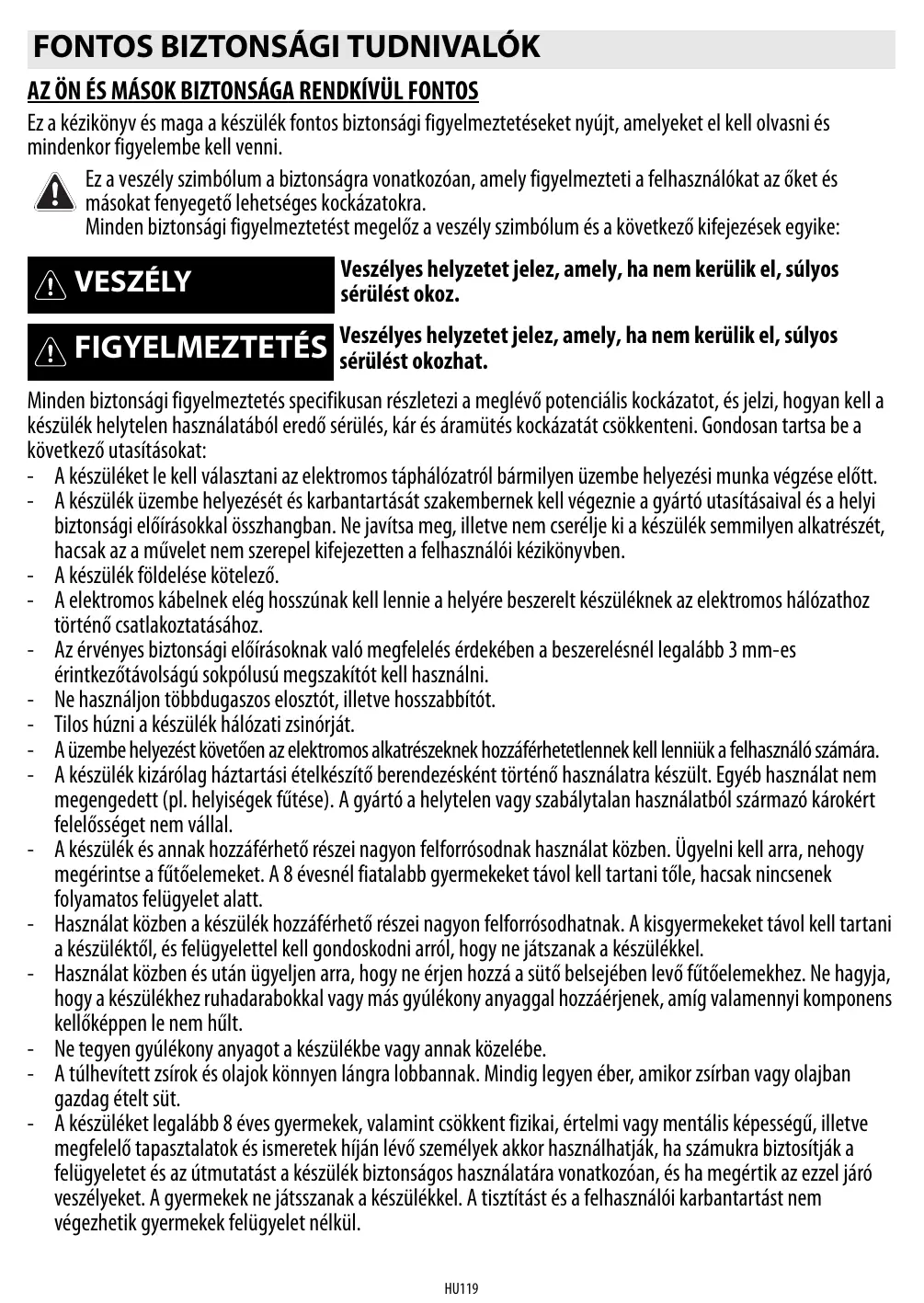 Minden biztonsági figyelmeztetés specifikusan részletezi a meglévő potenciális kockázatot, és jelzi, hogyan kell a készülék helytelen használatából eredő sérülés, kár és áramütés kockázatát csökkenteni. Gondosan tartsa be a következő utasításokat: - A készüléket le kell választani az elektromos táphálózatról bármilyen üzembe helyezési munka végzése előtt. - A készülék üzembe helyezését és karbantartását szakembernek kell végeznie a gyártó utasításaival és a helyi biztonsági előírásokkal összhangban. Ne javítsa meg, illetve nem cserélje ki a készülék semmilyen alkatrészét, hacsak az a művelet nem szerepel kifejezetten a felhasználói kézikönyvben. - A készülék földelése kötelező. - A elektromos kábelnek elég hosszúnak kell lennie a helyére beszerelt készüléknek az elektromos hálózathoz történő csatlakoztatásához. - Az érvényes biztonsági előírásoknak való megfelelés érdekében a beszerelésnél legalább 3 mm-es érintkezőtávolságú sokpólusú megszakítót kell használni. - Ne használjon többdugaszos elosztót, illetve hosszabbítót. - Tilos húzni a készülék hálózati zsinórját. - A üzembe helyezést követően az elektromos alkatrészeknek hozzáférhetetlennek kell lenniük a felhasználó számára. - A készülék kizárólag háztartási ételkészítő berendezésként történő használatra készült. Egyéb használat nem megengedett (pl. helyiségek fűtése). A gyártó a helytelen vagy szabálytalan használatból származó károkért felelősséget nem vállal. - A készülék és annak hozzáférhető részei nagyon felforrósodnak használat közben. Ügyelni kell arra, nehogy megérintse a fűtőelemeket. A 8 évesnél fiatalabb gyermekeket távol kell tartani tőle, hacsak nincsenek folyamatos felügyelet alatt. - Használat közben a készülék hozzáférhető részei nagyon felforrósodhatnak. A kisgyermekeket távol kell tartani a készüléktől, és felügyelettel kell gondoskodni arról, hogy ne játszanak a készülékkel. - Használat közben és után ügyeljen arra, hogy ne érjen hozzá a sütő belsejében levő fűtőelemekhez. Ne hagyja, hogy a készülékhez ruhadarabokkal vagy más gyúlékony anyaggal hozzáérjenek, amíg valamennyi komponens kellőképpen le nem hűlt. - Ne tegyen gyúlékony anyagot a készülékbe vagy annak közelébe. - A túlhevített zsírok és olajok könnyen lángra lobbannak. Mindig legyen éber, amikor zsírban vagy olajban gazdag ételt süt. - A készüléket legalább 8 éves gyermekek, valamint csökkent fizikai, értelmi vagy mentális képességű, illetve megfelelő tapasztalatok és ismeretek híján lévő személyek akkor használhatják, ha számukra biztosítják a felügyeletet és az útmutatást a készülék biztonságos használatára vonatkozóan, és ha megértik az ezzel járó veszélyeket. A gyermekek ne játsszanak a készülékkel. A tisztítást és a felhasználói karbantartást nem végezhetik gyermekek felügyelet nélkül. HU119