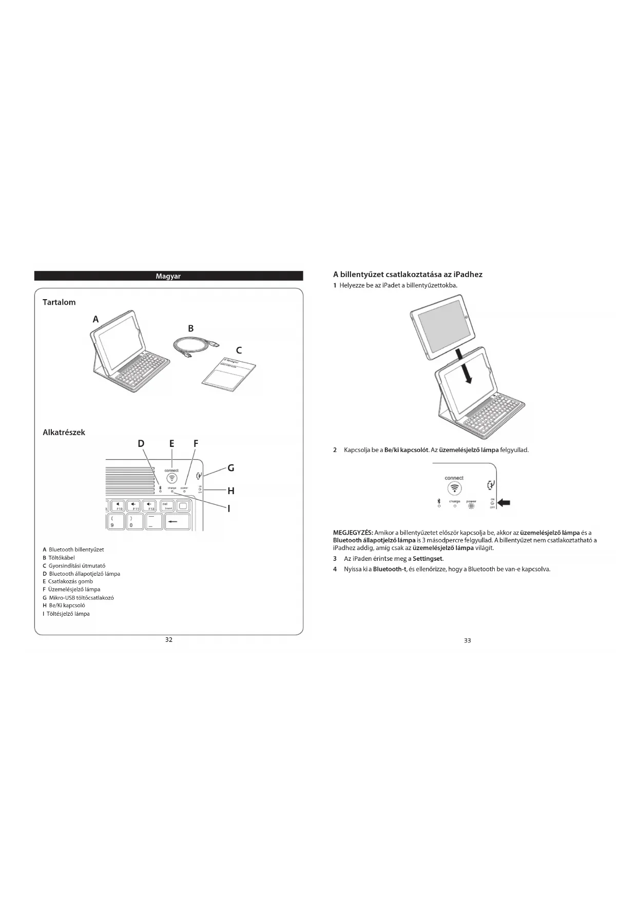 MEGJEGYZÉs: Amikor a billentyžetet eloször kapcsolja be, akkor az uzemelésjelzô lampa és a Bluetooth allapotjelzó lampa is 3 masodperce gyelluyad. A billentyütet nem csatlakoztathato a IPadzhad addig, amigCsakAz uzemelésjelzô lampa vilagit.