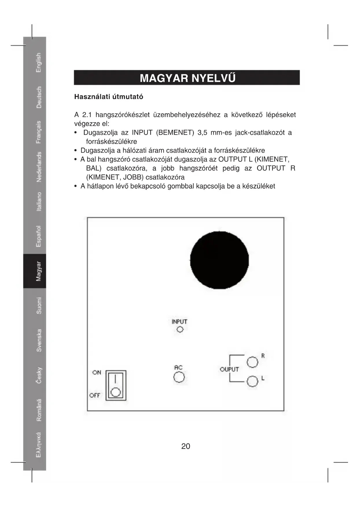 - A hátlapon lévő bekapcsoló gombbal kapcsolja be a készüléket21 Megfelelőségi nyilatkozat Mi, a Nedis B.V. De Tweeling 28 5215MC ’s-Hertogenbosch Hollandia Tel.: 0031 73 599 1055 E-mail: info@nedis.com Kijelentjük, hogy a termék: Gyártmánya: König Electronic Típusa: CMP-SP35 Megnevezése: 2.1 HANGSZÓRÓKÉSZLET Megfelel az alábbi szabványoknak: EN55022 +A1: 2007 EN55024: 1998+A1 : 2001 + A2: 2003 EN61000-3-2: 2006 EN61000-3-3: 1995 +A1: 2001 + A2: 2005 EN60950-1: 2006 Valamint megfelel a 2004/108/EK és 2006/95/EK Európai Uniós Irányelvekben támasztott követelményeknek. ‘s-Hertogenbosch, 2009. január 30. Mrs. J. Gilad értékesítési igazgató Megfelelőségi nyilatkozat. Egyetértek és elfogadom a Nedis B.V. Hollandia által adott nyilakozatot. Jacob Gilad HQ-Nedis kft. ügyvezető igazgató22 Biztonsági óvintézkedések: ÁRAMÜTÉS VESZÉLYE! NE NYISSA FEL! VIGYÁZAT! Az áramütés veszélyének csökkentése érdekében ezt a készüléket CSAK képzett szakember nyithatja fel, szervizelés céljából. Ha probléma adódik a készülékkel, kapcsolja le az elektromos hálózatról és más készülékről. Víztől és egyéb nedvességtől óvja. Karbantartás: Csak száraz ronggyal tisztítsa. Tisztító- és súrolószereket ne használjon. Jótállás: Nem vállalunk jótállást és felelősséget a terméken végzett változtatás vagy módosítás vagy a termék helytelen használata miatt bekövetkező károkért. Általános tudnivalók: A kivitel és a műszaki jellemzők előzetes értesítés nélkül is változhatnak. Minden logó, terméknév és márkanév a saját tulajdonosának márkaneve vagy bejegyzett márkaneve, és azokat ennek tiszteletben tartásával említjük. Figyelem! Ezt a terméket ezzel a jelöléssel láttuk el. Azt jelenti, hogy az elhasznált elektromos és elektronikus termékeket tilos az általános háztartási hulladékhoz keverni. Begyűjtésüket önálló begyűjtő létesítmények végzik. Copyright ©23 SUOMI