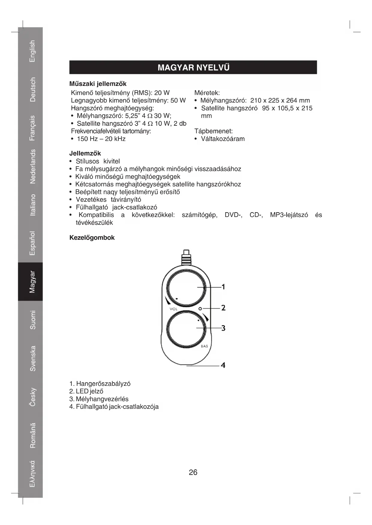 - Kompatibilis a következőkkel: számítógép, DVD-, CD-, MP3-lejátszó és tévékészülék Kezelőgombok
