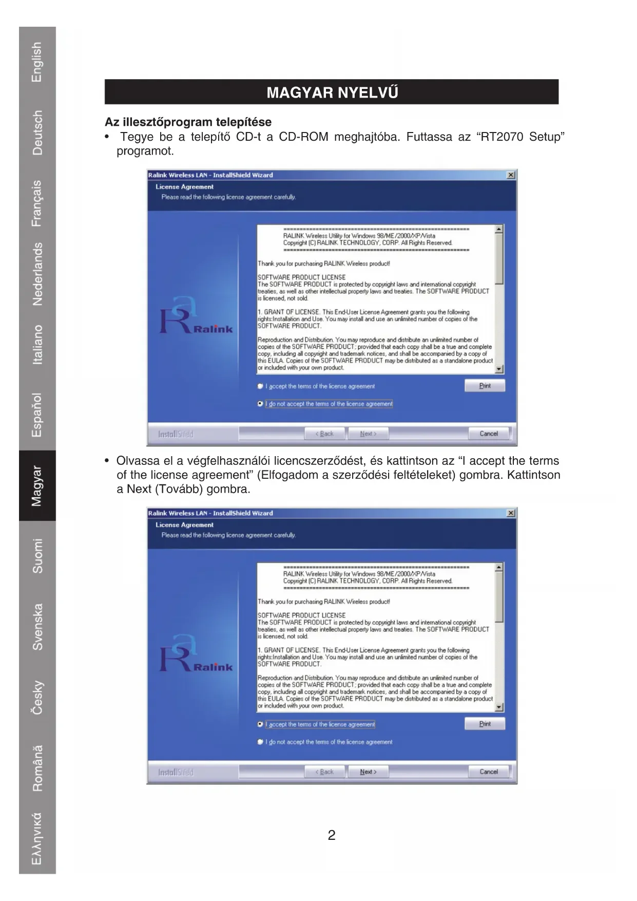 - Tegye be a telepítő CD-t a CD-ROM meghajtóba. Futtassa az “RT2070 Setup” programot.