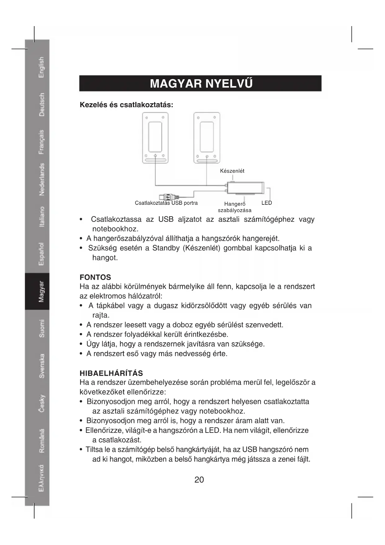 - Tiltsa le a számítógép belső hangkártyáját, ha az USB hangszóró nem ad ki hangot, miközben a belső hangkártya még játssza a zenei fájlt.21 Megfelelőségi nyilatkozat Mi, a Nedis B.V. De Tweeling 28 5215MC ’s-Hertogenbosch Hollandia Tel.: 0031 73 599 1055 E-mail: info@nedis.com Kijelentjük, hogy a termék, amelynek: Márkája: König Electronic Típusa: CMP-SPUSB30 Megnevezése: 2.0 hangszórókészlet, USB, 2 * 5 W Összhangban van az alábbi szabványokkal: EN55022: 1998 + A1: 2000 +A2: 2003 EN55024: 1998 + A1: 2001 + A2: 2003 EN61000-3-2: 2006 EN61000-3-3: 1995+A1: 2001 + A2: 2005 Valamint megfelel az 2004/108/EK Európai Uniós irányelv követelményeinek. ‘s-Hertogenbosch, 2009. március 25. Mrs. J. Gilad értékesítési igazgató Megfelelőségi nyilatkozat. Egyetértek és elfogadom a Nedis B.V. Hollandia által adott nyilakozatot. Jacob Gilad HQ-Nedis kft. ügyvezető igazgató22 Biztonsági óvintézkedések: Víztől és egyéb nedvességtől óvja. Karbantartás: Csak száraz ronggyal tisztítsa. Tisztító- és súrolószereket ne használjon. Jótállás: Nem vállalunk jótállást és felelősséget a terméken végzett változtatás vagy módosítás vagy a termék helytelen használata miatt bekövetkező károkért. Általános tudnivalók: A kivitel és a műszaki jellemzők előzetes értesítés nélkül is változhatnak. Minden logó, terméknév és márkanév a saját tulajdonosának márkaneve vagy bejegyzett márkaneve, és azokat ennek tiszteletben tartásával említjük. Őrizze meg ezt a kézikönyvet későbbi tanulmányozás céljára. Figyelem: Ezt a terméket ezzel a jelöléssel láttuk el. Azt jelenti, hogy az elhasznált elektromos és elektronikus termékeket tilos az általános háztartási hulladékhoz keverni. Begyűjtésüket önálló begyűjtő létesítmények végzik. Copyright ©23 SUOMI Toiminta ja kytkentä Liitä USB-porttiin Valmiustila Äänenvoimakkuuden säätö LED