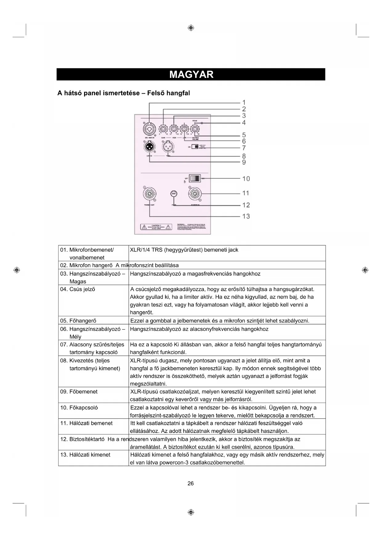 13. Hálózati kimenet Hálózati kimenet a felső hangfalakhoz, vagy egy másik aktív rendszerhez, mely