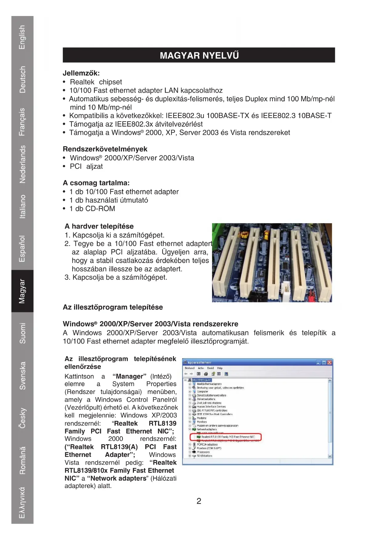2000/XP/Server 2003/Vista rendszerekre A Windows 2000/XP/Server 2003/Vista automatikusan felismerik és telepítik a 10/100 Fast ethernet adapter megfelelő illesztőprogramját. Az illesztőprogram telepítésének ellenőrzése Kattintson a “Manager” (Intéző) elemre a System Properties (Rendszer tulajdonságai) menüben, amely a Windows Control Panelról (Vezérlőpult) érhető el. A következőnek kell megjelennie: Windows XP/2003 rendszernél: “Realtek RTL8139 Family PCI Fast Ethernet NIC”; Windows 2000 rendszernél: (“Realtek RTL8139(A) PCI Fast Ethernet Adapter”; Windows Vista rendszernél pedig: “Realtek RTL8139/810x Family Fast Ethernet NIC” a “Network adapters” (Hálózati adapterek) alatt.3 Megfelelőségi nyilatkozat Mi, a Nedis B.V. De Tweeling 28 5215MC ’s-Hertogenbosch Hollandia Tel.: 0031 73 599 1055 E-mail: info@nedis.com Kijelentjük, hogy a termék, amelynek: Gyártmánya: König Electronic Típusa: CMP-NWCARD12 Megnevezése: 10/100 Mbit PCI LAN kártya Megfelel az alábbi szabványoknak EMC (Elektromágneses összeférhetőség) EN 55022: 1998+A1:2000+A2:2003 EN 55024: 1998+A1:2001+A2:2003 EN 61000-3-2:2000 EN 61000-3-3:1995+A1:2001 Valamint megfelel az Európai Uniós irányelvekben támasztott követelményeknek. 2004/108/EK ‘s-Hertogenbosch, 2009. május 01. Mrs. J. Gilad értékesítési igazgató Megfelelőségi nyilatkozat. Egyetértek és elfogadom a Nedis B.V. Hollandia által adott nyilakozatot. Jacob Gilad HQ-Nedis kft. ügyvezető igazgató4 Biztonsági óvintézkedések: ÁRAMÜTÉS VESZÉLYE! NE NYISSA FEL! VIGYÁZAT! Az áramütés veszélyének csökkentése érdekében ezt a készüléket KIZÁRÓLAG megbízott szakember nyithatja fel, szervizelés céljából. Ha probléma adódik a készülékkel, kapcsolja le az elektromos hálózatról és más készülékről. Víztől és egyéb nedvességtől védje. Karbantartás: Csak száraz ronggyal tisztítsa. Tisztító- és súrolószereket ne használjon. Jótállás: Nem vállalunk jótállást és felelősséget a terméken végzett változtatás vagy módosítás vagy a termék helytelen használata miatt bekövetkező károkért. Általános információk: A kivitel és a műszaki jellemzők előzetes értesítés nélkül is változhatnak. Minden logó, terméknév és márkanév a saját tulajdonosának márkaneve vagy bejegyzett márkaneve, és azokat ennek tiszteletben tartásával említjük. Őrizze meg ezt a kezelési útmutatót és a csomagolást későbbi felhasználás céljára. Figyelem: Ezt a terméket ezzel a jelöléssel láttuk el. Azt jelenti, hogy az elhasznált elektromos és elektronikus termékeket tilos az általános háztartási hulladékhoz keverni Begyűjtésüket külön begyűjtő létesítmény végzi. Copyright ©CMP-NWCARD12 10/100 Mbitin PCI LAN-kortti2 SUOMI Ominaisuudet