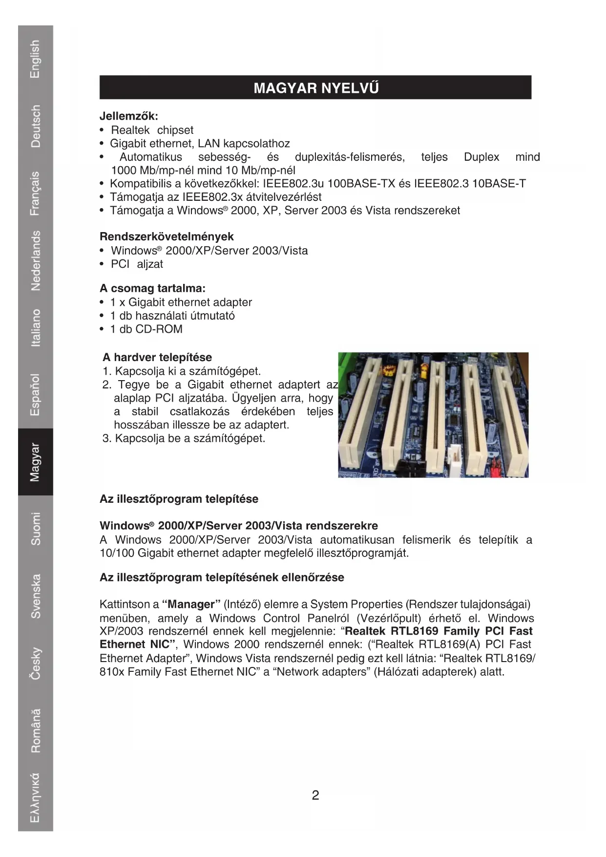 Kattintson a "Manager" (Intézó) elemre a System Properties (Rendszer tulajdonságai) menüben, amely a Windows Control Panelrol (Vezérlopult) érhető el. Windows XP/2003 rendszernél ennek kell megjelennie: "Realtek RTL8169 Family PCI Fast Ethernet NIC", Windows 2000 rendszernél ennek: ("Realtek RTL8169(A) PCI Fast Ethernet Adapter", Windows Vista rendszernél pedig ezt kellátnia: "Realtek RTL8169/810x Family Fast Ethernet NIC" a "Network adapters" (Hálozati adapterek) alatt.