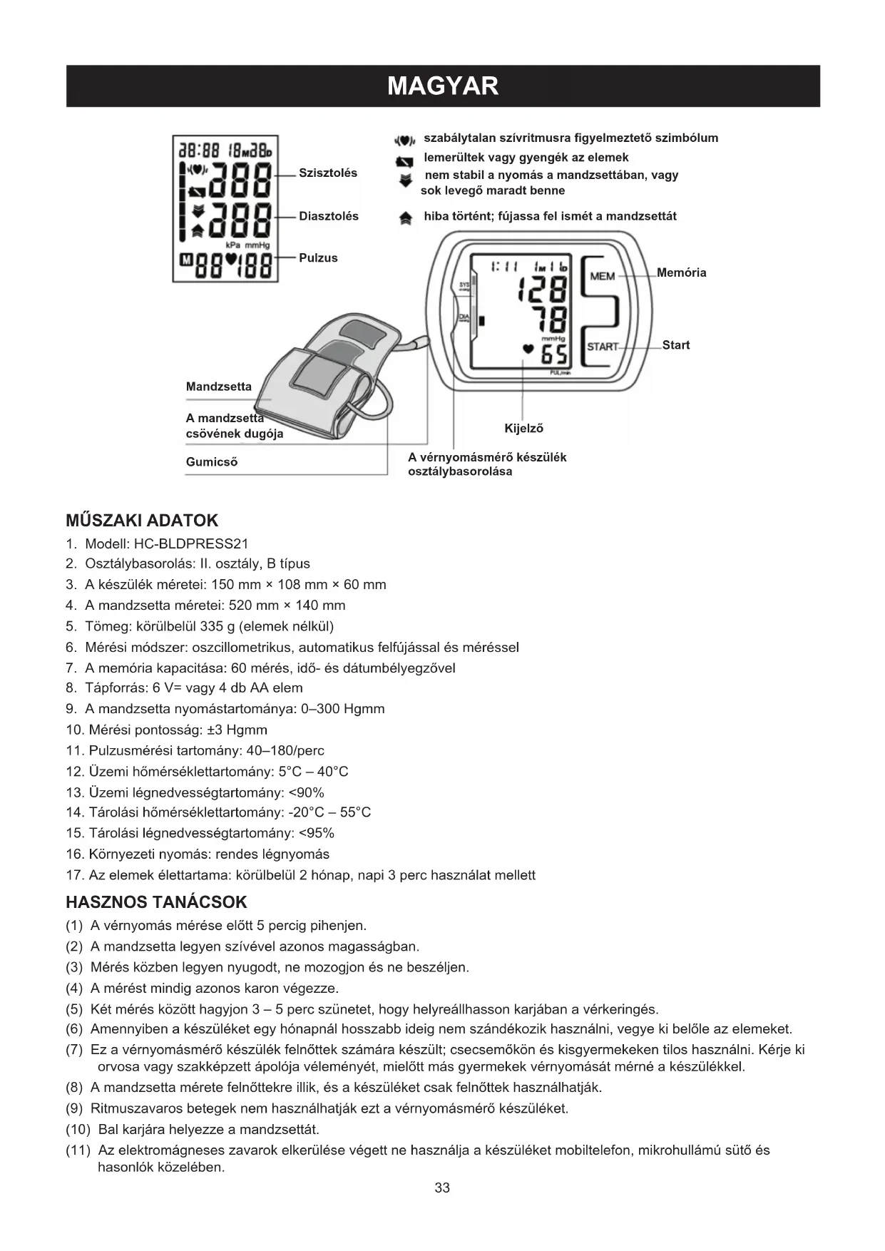 (1) A vérnyomás mérése előtt 5 percig pihenjen. (2) A mandzsetta legyen szívével azonos magasságban. (3) Mérés közben legyen nyugodt, ne mozogjon és ne beszéljen. (4) A mérést mindig azonos karon végezze. (5) Két mérés között hagyjon 3 – 5 perc szünetet, hogy helyreállhasson karjában a vérkeringés. (6) Amennyiben a készüléket egy hónapnál hosszabb ideig nem szándékozik használni, vegye ki belőle az elemeket. (7) Ez a vérnyomásmérő készülék felnőttek számára készült; csecsemőkön és kisgyermekeken tilos használni. Kérje ki orvosa vagy szakképzett ápolója véleményét, mielőtt más gyermekek vérnyomását mérné a készülékkel. (8) A mandzsetta mérete felnőttekre illik, és a készüléket csak felnőttek használhatják. (9) Ritmuszavaros betegek nem használhatják ezt a vérnyomásmérő készüléket. (10) Bal karjára helyezze a mandzsettát. (11) Az elektromágneses zavarok elkerülése végett ne használja a készüléket mobiltelefon, mikrohullámú sütő és hasonlók közelében.34 A KÉSZÜLÉK ELŐKÉSZÍTÉSE ÉS HASZNÁLATA