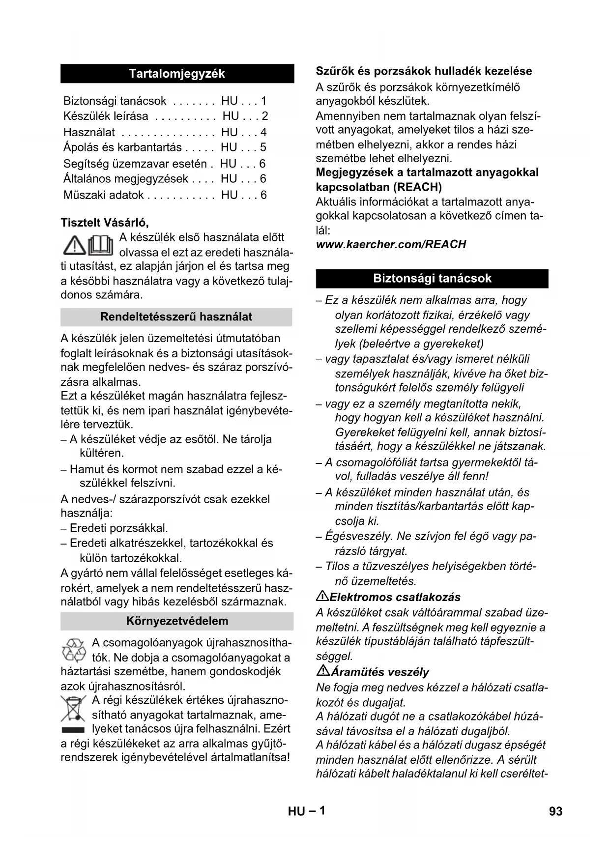 - Сетевой шнур Уровень звукового давления (EN 60704-2-1) Вес без (принадлежностей) 92 RUMagyar – 1 Tisztelt Vásárló, A készülék első használata előtt olvassa el ezt az eredeti használa- ti utasítást, ez alapján járjon el és tartsa meg a későbbi használatra vagy a következő tulaj- donos számára. A készülék jelen üzemeltetési útmutatóban foglalt leírásoknak és a biztonsági utasítások- nak megfelelően nedves- és száraz porszívó- zásra alkalmas. Ezt a készüléket magán használatra fejlesz- tettük ki, és nem ipari használat igénybevéte- lére terveztük. – A készüléket védje az esőtől. Ne tárolja kültéren. – Hamut és kormot nem szabad ezzel a ké- szülékkel felszívni. A nedves-/ szárazporszívót csak ezekkel használja: – Eredeti porzsákkal. – Eredeti alkatrészekkel, tartozékokkal és külön tartozékokkal. A gyártó nem vállal felelősséget esetleges ká- rokért, amelyek a nem rendeltetésszerű hasz- nálatból vagy hibás kezelésből származnak. A csomagolóanyagok újrahasznosítha- tók. Ne dobja a csomagolóanyagokat a háztartási szemétbe, hanem gondoskodjék azok újrahasznosításról. A régi készülékek értékes újrahaszno- sítható anyagokat tartalmaznak, ame- lyeket tanácsos újra felhasználni. Ezért a régi készülékeket az arra alkalmas gyűjtő- rendszerek igénybevételével ártalmatlanítsa! A szűrők és porzsákok környezetkímélő anyagokból készlütek. Amennyiben nem tartalmaznak olyan felszí- vott anyagokat, amelyeket tilos a házi sze- métben elhelyezni, akkor a rendes házi szemétbe lehet elhelyezni. Megjegyzések a tartalmazott anyagokkal kapcsolatban (REACH) Aktuális információkat a tartalmazott anya- gokkal kapcsolatosan a következő címen ta- lál: www.kaercher.com/REACH – Ez a készülék nem alkalmas arra, hogy olyan korlátozott fizikai, érzékelő vagy szellemi képességgel rendelkező szemé- lyek (beleértve a gyerekeket) – vagy tapasztalat és/vagy ismeret nélküli személyek használják, kivéve ha őket biz- tonságukért felelős személy felügyeli – vagy ez a személy megtanította nekik, hogy hogyan kell a készüléket használni. Gyerekeket felügyelni kell, annak biztosí- tásáért, hogy a készülékkel ne játszanak. – A csomagolófóliát tartsa gyermekektől tá- vol, fulladás veszélye áll fenn! – A készüléket minden használat után, és minden tisztítás/karbantartás előtt kap- csolja ki. – Égésveszély. Ne szívjon fel égő vagy pa- rázsló tárgyat. – Tilos a tűzveszélyes helyiségekben törté- nő üzemeltetés. 몇 Elektromos csatlakozás A készüléket csak váltóárammal szabad üze- meltetni. A feszültségnek meg kell egyeznie a készülék típustábláján található tápfeszült- séggel. Áramütés veszély Ne fogja meg nedves kézzel a hálózati csatla- kozót és dugaljat. A hálózati dugót ne a csatlakozókábel húzá- sával távosítsa el a hálózati dugaljból. A hálózati kábel és a hálózati dugasz épségét minden használat előtt ellenőrizze. A sérült hálózati kábelt haladéktalanul ki kell cseréltet- Tartalomjegyzék Biztonsági tanácsok
