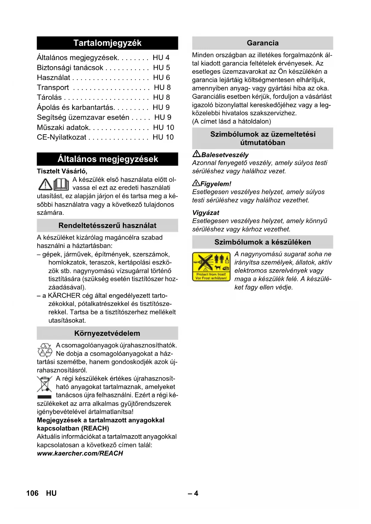 Тип: 1.674-xxx Основные директивы ЕС 2006/42/EC (+2009/127/EC) 2004/108/ÅÑ 2000/14/ЕС Примененные гармонизированные нормы EN 55014–1: 2006 + A1: 2009 EN 55014–2: 1997 + A2: 2008 EN 60335–1 EN 60335–2–79 EN 61000–3–2: 2006 + A2: 2009 EN 61000–3–3: 2008 EN 62233: 2008 Примененный порядок оценки соответствия 2000/14/ЕС: Приложение V Уровень мощности звука dB(A) Измерено:86 Гарантировано:89 CEO Head of Approbation 105RU– 4 Tisztelt Vásárló, A készülék első használata előtt ol- vassa el ezt az eredeti használati utasítást, ez alapján járjon el és tartsa meg a ké- sőbbi használatra vagy a következő tulajdonos számára. A készüléket kizárólag magáncélra szabad használni a háztartásban: – gépek, járművek, építmények, szerszámok, homlokzatok, teraszok, kertápolási eszkö- zök stb. nagynyomású vízsugárral történő tisztítására (szükség esetén tisztítószer hoz- záadásával). – a KÄRCHER cég által engedélyezett tarto- zékokkal, pótalkatrészekkel és tisztítósze- rekkel. Tartsa be a tisztítószerhez mellékelt utasításokat. A csomagolóanyagok újrahasznosíthatók. Ne dobja a csomagolóanyagokat a ház- tartási szemétbe, hanem gondoskodjék azok új- rahasznosításról. A régi készülékek értékes újrahasznosít- ható anyagokat tartalmaznak, amelyeket tanácsos újra felhasználni. Ezért a régi ké- szülékeket az arra alkalmas gyűjtőrendszerek igénybevételével ártalmatlanítsa! Megjegyzések a tartalmazott anyagokkal kapcsolatban (REACH) Aktuális információkat a tartalmazott anyagokkal kapcsolatosan a következő címen talál: www.kaercher.com/REACH Minden országban az illetékes forgalmazónk ál- tal kiadott garancia feltételek érvényesek. Az esetleges üzemzavarokat az Ön készülékén a garancia lejártáig költségmentesen elhárítjuk, amennyiben anyag- vagy gyártási hiba az oka. Garanciális esetben kérjük, forduljon a vásárlást igazoló bizonylattal kereskedőjéhez vagy a leg- közelebbi hivatalos szakszervizhez. (A címet lásd a hátoldalon) Balesetveszély Azonnal fenyegető veszély, amely súlyos testi sérüléshez vagy halálhoz vezet. 몇 Figyelem! Esetlegesen veszélyes helyzet, amely súlyos testi sérüléshez vagy halálhoz vezethet. Vigyázat Esetlegesen veszélyes helyzet, amely könnyű sérüléshez vagy kárhoz vezethet. A nagynyomású sugarat soha ne irányítsa személyek, állatok, aktív elektromos szerelvények vagy maga a készülék felé. A készülé- ket fagy ellen védje. Tartalomjegyzék Általános megjegyzések. . . . . . . . HU 4 Biztonsági tanácsok . . . . . . . . . . . HU 5 Használat . . . . . . . . . . . . . . . . . . . HU 6 Transport . . . . . . . . . . . . . . . . . . . HU 8 Tárolás . . . . . . . . . . . . . . . . . . . . . HU 8 Ápolás és karbantartás. . . . . . . . . HU 9 Segítség üzemzavar esetén . . . . . HU 9 Műszaki adatok. . . . . . . . . . . . . . . HU 10 CE-Nyilatkozat . . . . . . . . . . . . . . . HU 10 Általános megjegyzések Rendeltetésszerű használat Környezetvédelem Garancia Szimbólumok az üzemeltetési útmutatóban Szimbólumok a készüléken 106 HU– 5 Balesetveszély Ne fogja meg nedves kézzel a hálózati csat- lakozót és dugaljat. A készüléket ne helyezze üzembe, ha a há- lózati csatlakozóvezeték vagy a készülék fontos alkatrészei, pl. magasnyomású tömlő, kézi szórópisztoly vagy biztonsági elemek meg vannak sérülve. Minden üzem előtt ellenőrizze, hogy nem sé- rült-e a hálózati dugós csatlakozóvezeték. A sérült hálózati csatlakozóvezetéket azonnal cseréltesse ki felhatalmazott szervizzel/villa- mos szakemberrel. Ellenőrize a nagynyomású tömlő épségét minden használat előtt. A sérült nagynyomá- sú tömlőt azonnal ki kell cserélni. Tilos a tűzveszélyes helyiségekben történő üzemeltetés. A készülék veszélyes területen (pl.: benzin- kúton) történő alkalmazása esetén figyelem- be kell venni a megfelelő biztonsági előírásokat. A nagynyomású vízsugár veszélyes lehet szakszerűtlen használat esetén. A vízsuga- rat soha ne irányítsa személyre, állatra, mű- ködésben lévő elektromos alkatrészre vagy a készülékre magára. A magasnyomású vízsugarat ne irányítsa se önmagára se másokra, a ruházat vagy a láb- beli tisztítására. Nem szabad olyan tárgyat lelocsolni, amely egészségre káros anyagot (pl. azbesztet) tartalmaz. Az autógumit/szelepet a nagynyomású su- gár károsíthatja és roncsolhatja. A károso- dás első jele az autógumi elszíneződése. A sérült autógumik/kerékszelepek életveszé- lyesek. A tisztítás során legalább 30 cm tá- volságot kell betartani! Robbanásveszély! Gyúlékony folyadékot nem szabad perme- tezni vele. Soha ne szívjon fel oldószer tartalmú folya- dékot vagy hígítatlan savakat és oldószere- ket! Ide tartozik pl. a benzin, a hígító vagy a fűtőolaj. A permetköd nagyon gyúlékony, robbanékony és mérgező. Ne használjon acetont, hígítatlan savakat és oldószereket, mivel ezek a készülékben lévő anyagokat megtámadják. 몇 Figyelem! A hosszabbító vezeték hálózati dugójának és csatlakozójának vízállónak kell lenni és nem szabad vízben feküdni. A nem megfelelő hosszabbítóvezetékek ve- szélyesek lehetnek. A szabadban kizárólag az adott célra engedélyezett és megfelelő je- löléssel ellátott, megfelelő keresztmetszetű hosszabbítóvezetékeket használjon:
