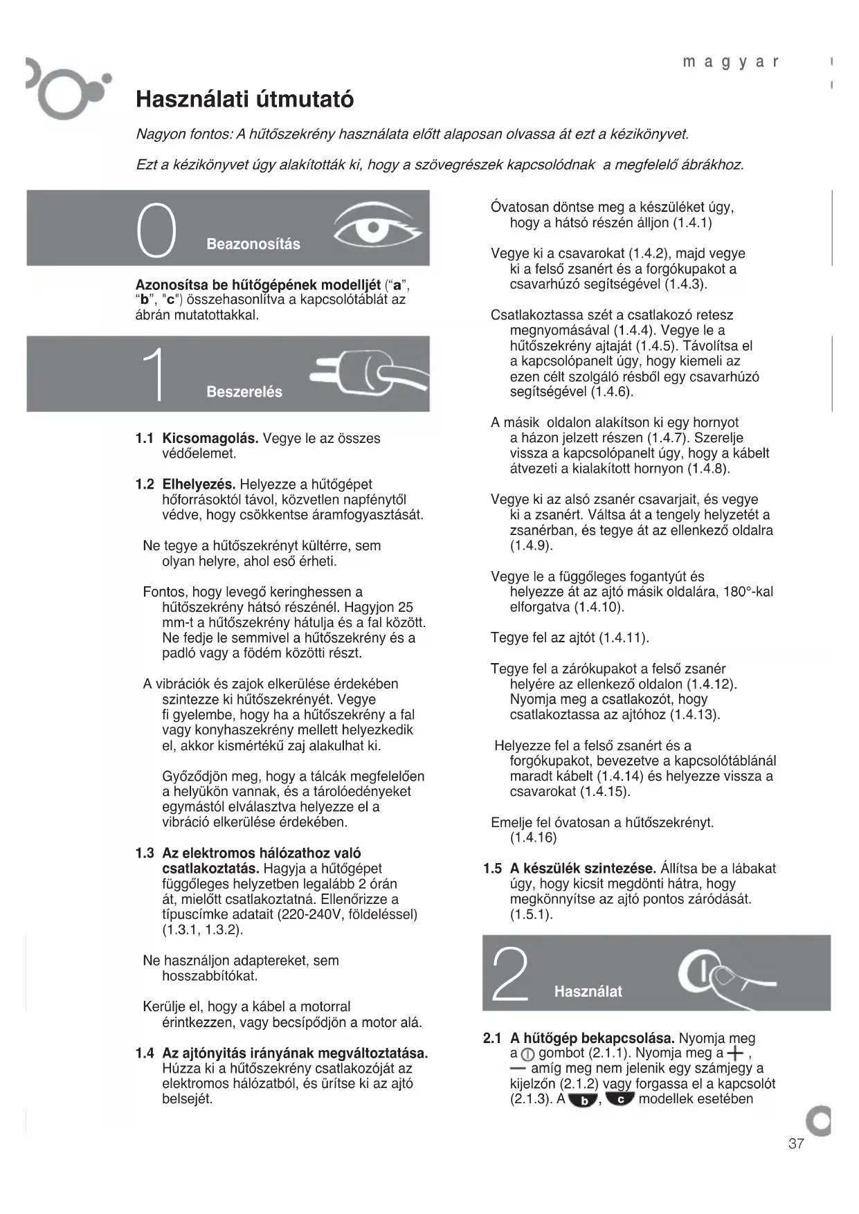 “b”, "c") összehasonlítva a kapcsolótáblát az ábrán mutatottakkal.1.1 Kicsomagolás. Vegye le az összes védőelemet.1.2 Elhelyezés. Helyezze a hűtőgépet hőforrásoktól távol, közvetlen napfénytől védve, hogy csökkentse áramfogyasztását. Ne tegye a hűtőszekrényt kültérre, sem olyan helyre, ahol eső érheti. Fontos, hogy levegő keringhessen a hűtőszekrény hátsó részénél. Hagyjon 25 mm-t a hűtőszekrény hátulja és a fal között. Ne fedje le semmivel a hűtőszekrény és a padló vagy a födém közötti részt. A vibrációk és zajok elkerülése érdekében szintezze ki hűtőszekrényét. Vegye fi gyelembe, hogy ha a hűtőszekrény a fal vagy konyhaszekrény mellett helyezkedik el, akkor kismértékű zaj alakulhat ki. Győződjön meg, hogy a tálcák megfelelően a helyükön vannak, és a tárolóedényeket egymástól elválasztva helyezze el a vibráció elkerülése érdekében.1.3 Az elektromos hálózathoz való csatlakoztatás. Hagyja a hűtőgépet függőleges helyzetben legalább 2 órán át, mielőtt csatlakoztatná. Ellenőrizze a típuscímke adatait (220-240V, földeléssel) (1.3.1, 1.3.2). Ne használjon adaptereket, sem hosszabbítókat. Kerülje el, hogy a kábel a motorral érintkezzen, vagy becsípődjön a motor alá.1.4 Az ajtónyitás irányának megváltoztatása. Húzza ki a hűtőszekrény csatlakozóját az elektromos hálózatból, és ürítse ki az ajtó belsejét. 0