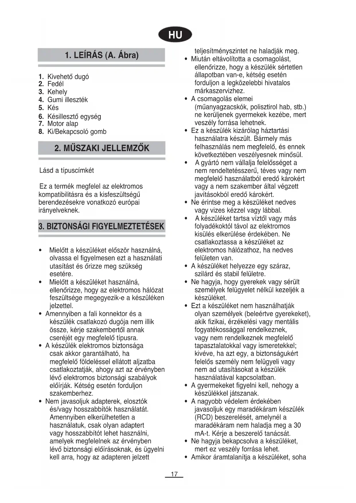 • A készülék elektromos biztonsága