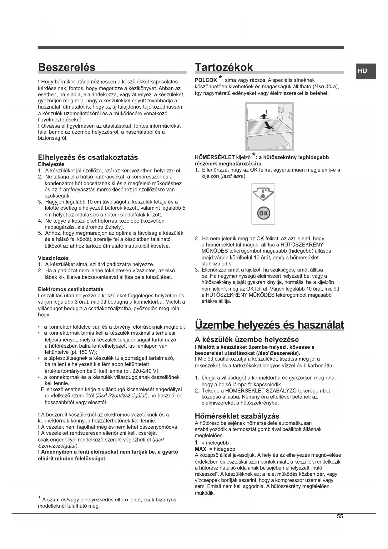 Beszerelés ! Hogy bármikor utána nézhessen a készülékkel kapcsolatos kérdéseinek, fontos, hogy megőrizze a kézikönyvet. Abban az esetben, ha eladja, elajándékozza, vagy áthelyezi a készüléket, győződjön meg róla, hogy a készülékkel együtt továbbadja a használati útmutatót is, hogy az új tulajdonos tájékozódhasson a készülék üzemeltetéséről és a működésére vonatkozó gyelmeztetésekről.! Olvassa el gyelmesen az utasításokat: fontos információkat talál benne az üzembe helyezésről, a használatról és a biztonságról. Elhelyezés és csatlakoztatás Elhelyezés1. A készüléket jól szellőző, száraz környezetben helyezze el.2. Ne takarja el a hátsó hűtőrácsokat: a kompresszor és a kondenzátor hőt bocsátanak ki és a megfelelő működéshez és az áramfogyasztás mérsékléséhez jó szellőzésre van szükségük.3. Hagyjon legalább 10 cm távolságot a készülék teteje és a fölötte esetleg elhelyezett bútorok között, valamint legalább 5 cm helyet az oldalak és a bútorok/oldalfalak között.4. Ne tegye a készüléket hőforrás közelébe (közvetlen napsugárzás, elektromos tűzhely).5. Ahhoz, hogy megmaradjon az optimális távolság a készülék és a hátsó fal között, szerelje fel a készletben található ütközőt az ahhoz tartozó útmutató instrukcióit követve.Vízszintezés1. A készüléket sima, szilárd padlózatra helyezze.2. Ha a padlózat nem lenne tökéletesen vízszintes, az első lábak ki-, illetve becsavarásával állítsa be a készüléket.Elektromos csatlakoztatásLeszállítás után helyezze a készüléket függőleges helyzetbe és várjon legalább 3 órát, mielőtt bedugná a konnektorba. Mielőtt a villásdugót bedugja a csatlakozóaljzatba, győződjön meg róla, hogy:• a konnektor földelve van és a törvényi előírásoknak megfelel;• a konnektornak bírnia kell a készülék maximális terhelési teljesítményét, mely a készülék tulajdonságait tartalmazó, a hűtőrészben balra lent elhelyezett kis fémlapon van feltüntetve (pl. 150 W);• a tápfeszültségnek a készülék tulajdonságait tartalmazó, balra lent elhelyezett kis fémlapon feltüntetett értéktartományon belül kell lennie (pl. 220-240 V);• a konnektornak és a készülék villásdugójának összeillőnek kell lennie. Ellenkező esetben kérje a villásdugó kicserélését engedéllyel rendelkező szerelőtől (lásd Szervizszolgálat); ne használjon hosszabbítót vagy elosztót.! A beszerelt készüléknél az elektromos vezetéknek és a konnektornak könnyen hozzáférhetőnek kell lennie.! A vezeték nem hajolhat meg és nem lehet összenyomódva.! A vezetéket rendszeresen ellenőrizni kell, cseréjét csak engedéllyel rendelkező szerelő végezheti el (lásd Szervizszolgálat).! Amennyiben a fenti előírásokat nem tartják be, a gyártó elhárít minden felelősséget. Tartozékok POLCOK *: sima vagy rácsos. A speciális síneknek köszönhetően kivehetőek és magasságuk állítható (lásd ábra), így nagyméretű edényeket vagy élelmiszereket is betehet.HŐMÉRSÉKLET kijelző *: a hűtőszekrény leghidegebb részének meghatározására.1. Ellenőrizze, hogy az OK felirat egyértelműen megjelenik-e a kijelzőn (lásd ábra).2. Ha nem jelenik meg az OK felirat, az azt jelenti, hogy a hőmérséklet túl magas: állítsa a HŰTŐSZEKRÉNY MŰKÖDÉS tekerőgombot magasabb (hidegebb) állásba, majd várjon körülbelül 10 órát, amíg a hőmérséklet stabilizálódik.3. Ellenőrizze ismét a kijelzőt: ha szükséges, ismét állítsa be. Ha nagymennyiségű élelmiszert helyezett be, vagy a hűtőszekrény ajtaját gyakran kinyitja, normális, ha a kijelzőn nem jelenik meg az OK felirat. Várjon legalább 10 órát, mielőtt a HŰTŐSZEKRÉNY MŰKÖDÉS tekerőgombot magasabb értékre állítja. Üzembe helyezés és használat A készülék üzembe helyezése ! Mielőtt a készüléket üzembe helyezi, kövesse a beszerelési utasításokat (lásd Beszerelés).! Mielőtt csatlakoztatja a készüléket, tisztítsa meg jól a rekeszeket és a tartozékokat langyos vízzel és bikarbonáttal.1. Dugja a villásdugót a konnektorba és győződjön meg róla, hogy a belső lámpa felkapcsolódik.2. Tekerje a HŐMÉRSÉKLET SZABÁLYZÓ tekerőgombot középső állásba. Néhány óra elteltével beteheti az élelmiszereket a hűtőszekrénybe. Hőmérséklet szabályzás A hűtőrész belsejének hőmérséklete automatikusan szabályozódik a termosztát gombjával beállított állásnak megfelelően. 1 = melegebb MAX = hidegebbA középső állást javasoljuk. A hely és az elhelyezés megnövelése érdekében és esztétikai szempontok miatt, a készülék rendelkezik a hűtőrész hátulsó oldalának belsejében elhelyezett „hűtő rekesszel”. A készüléknek ezt a falát működés közben dér, vagy vízcseppek borítják aszerint, hogy a kompresszor üzemel vagy sem. Emiatt nem kell aggódnia. A hűtőszekrény megfelelően működik.
