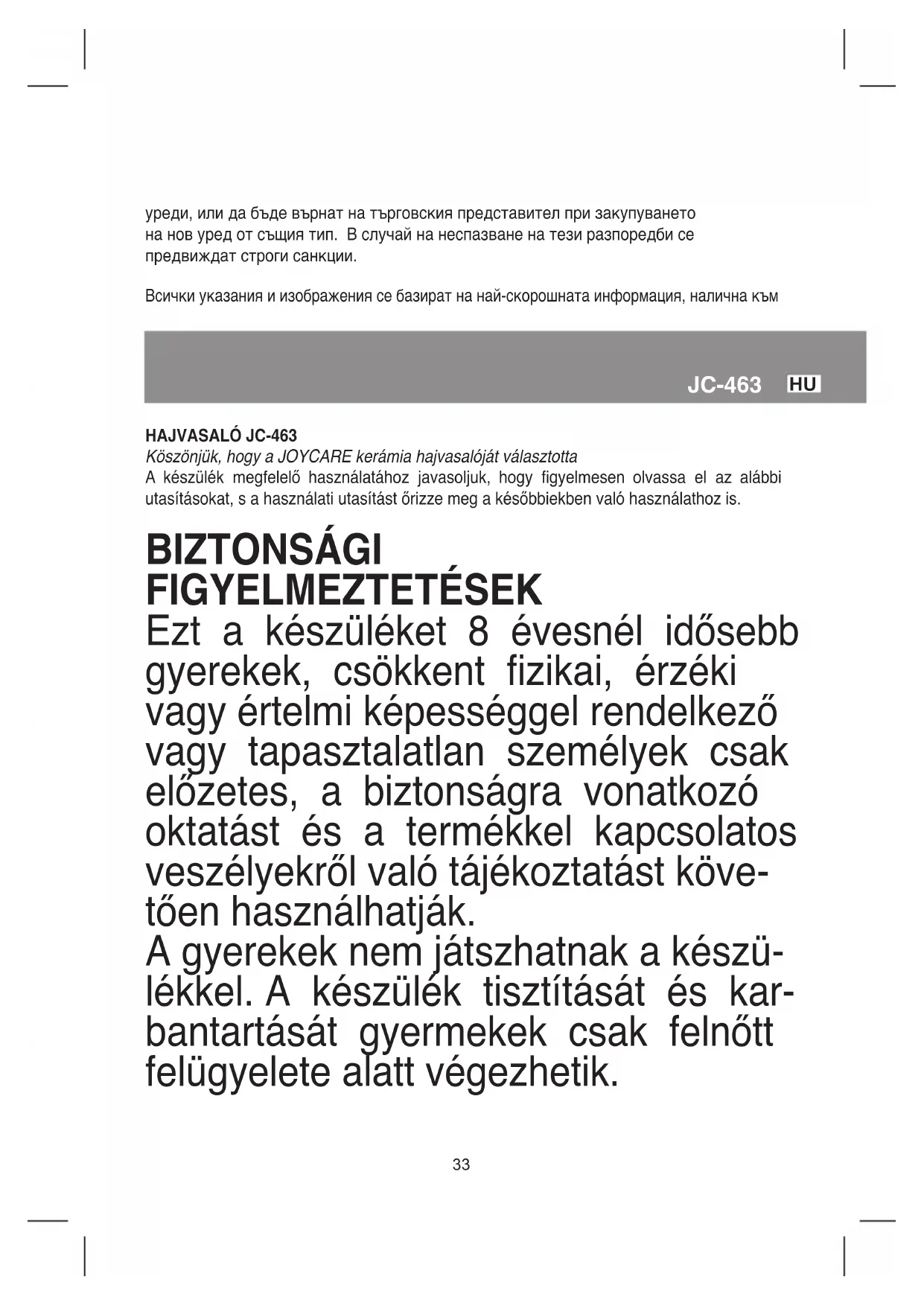 hAJVASALÓ JC-463 Köszönjük, hogy a JOYCARE kerámia hajvasalóját választotta A készülék megfelelő használatához javasoljuk, hogy gyelmesen olvassa el az alábbi utasításokat, s a használati utasítást őrizze meg a későbbiekben való használathoz is. BIZTONSÁGI fIGYELMEZTETÉSEK Ezt a készüléket 8 évesnél idősebb gyerekek, csökkent zikai, érzéki vagy értelmi képességgel rendelkező vagy tapasztalatlan személyek csak előzetes, a biztonságra vonatkozó oktatást és a termékkel kapcsolatos veszélyekről való tájékoztatást köve- tően használhatják. A gyerekek nem játszhatnak a készü- lékkel. A készülék tisztítását és kar- bantartását gyermekek csak felnőtt felügyelete alatt végezhetik.34