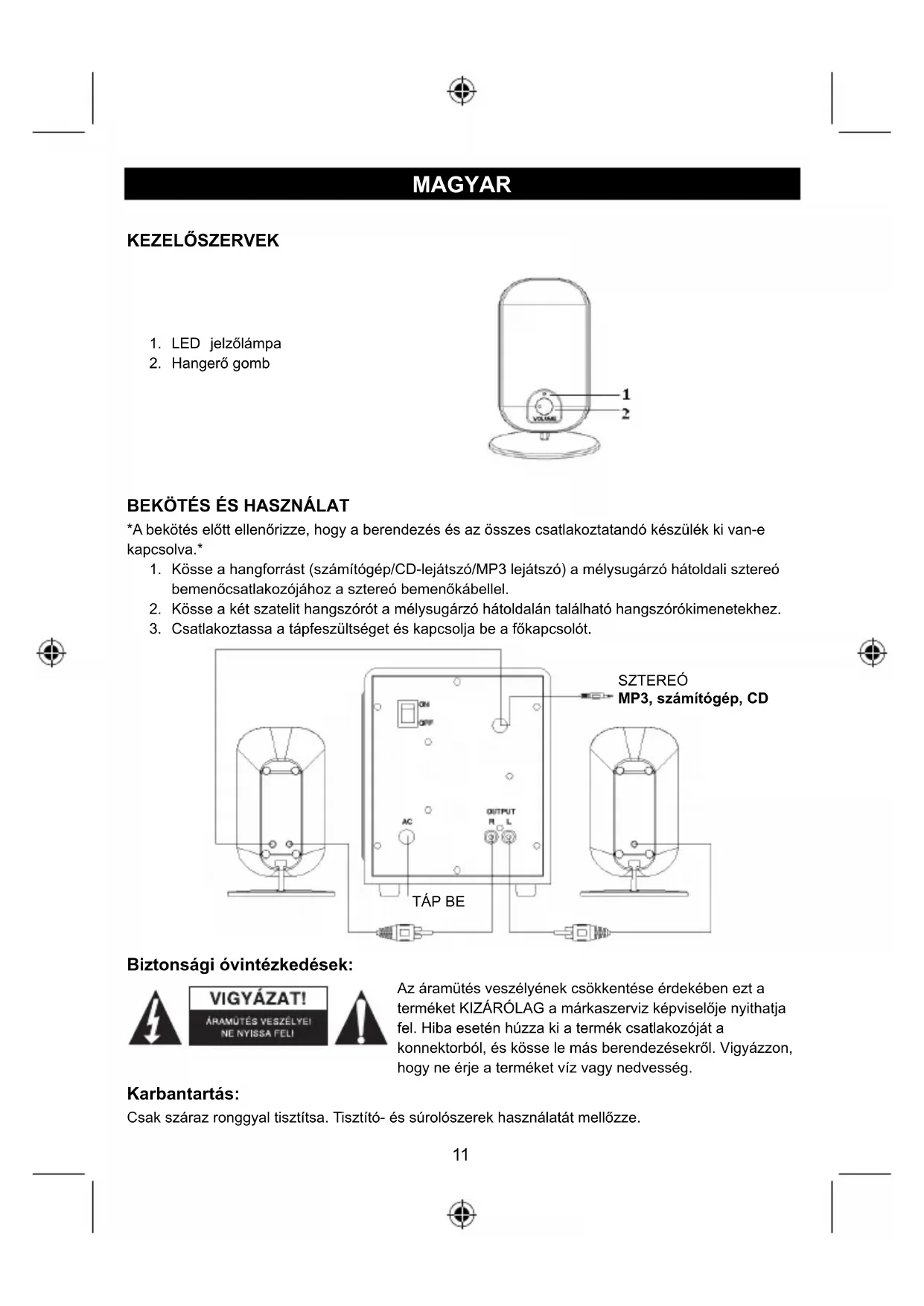 Biztonsági óvintézkedések: Az áramütés veszélyének csökkentése érdekében ezt a terméket KIZÁRÓLAG a márkaszerviz képviselője nyithatja fel. Hiba esetén húzza ki a termék csatlakozóját a konnektorból, és kösse le más berendezésekről. Vigyázzon, hogy ne érje a terméket víz vagy nedvesség. Karbantartás: Csak száraz ronggyal tisztítsa. Tisztító- és súrolószerek használatát mellőzze. SZTEREÓ MP3, számítógép, CD