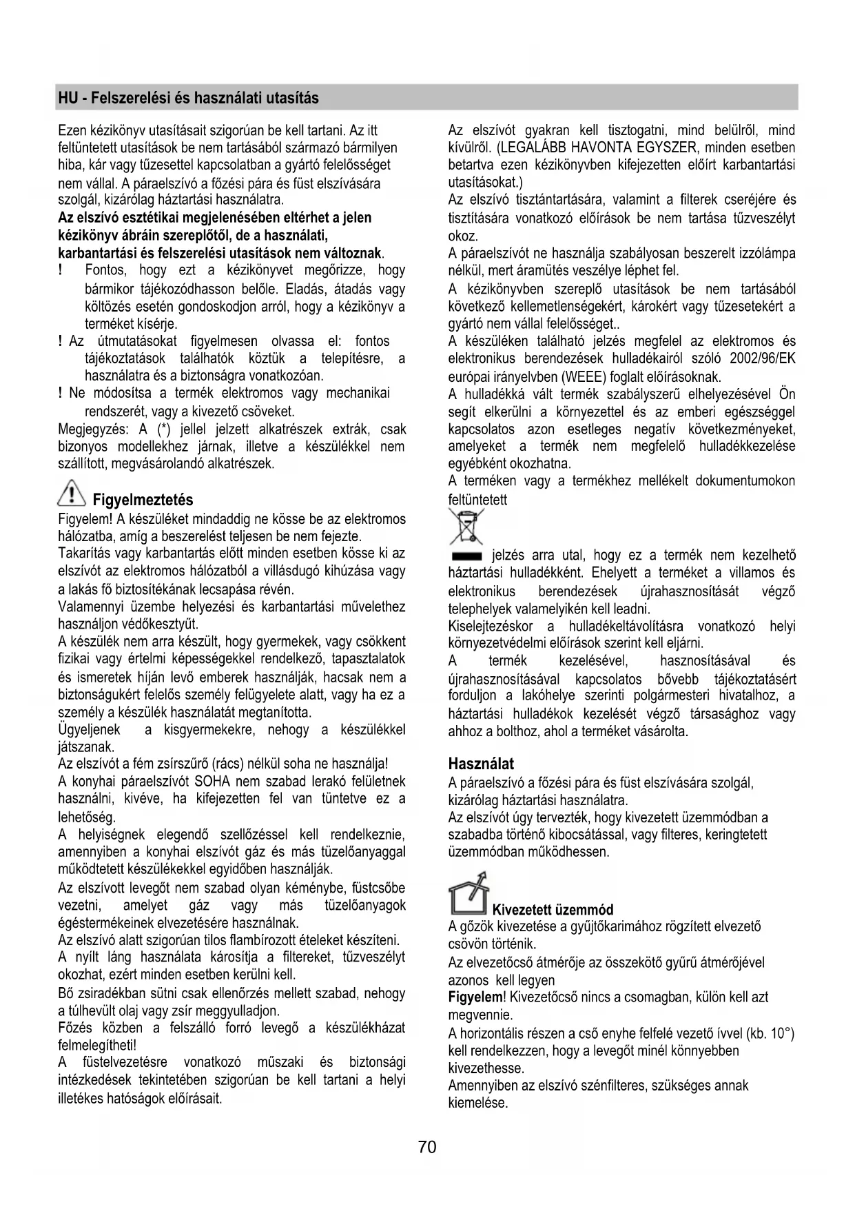 Figyelem! Az elszívó tisztán tartására, valamint a filterek