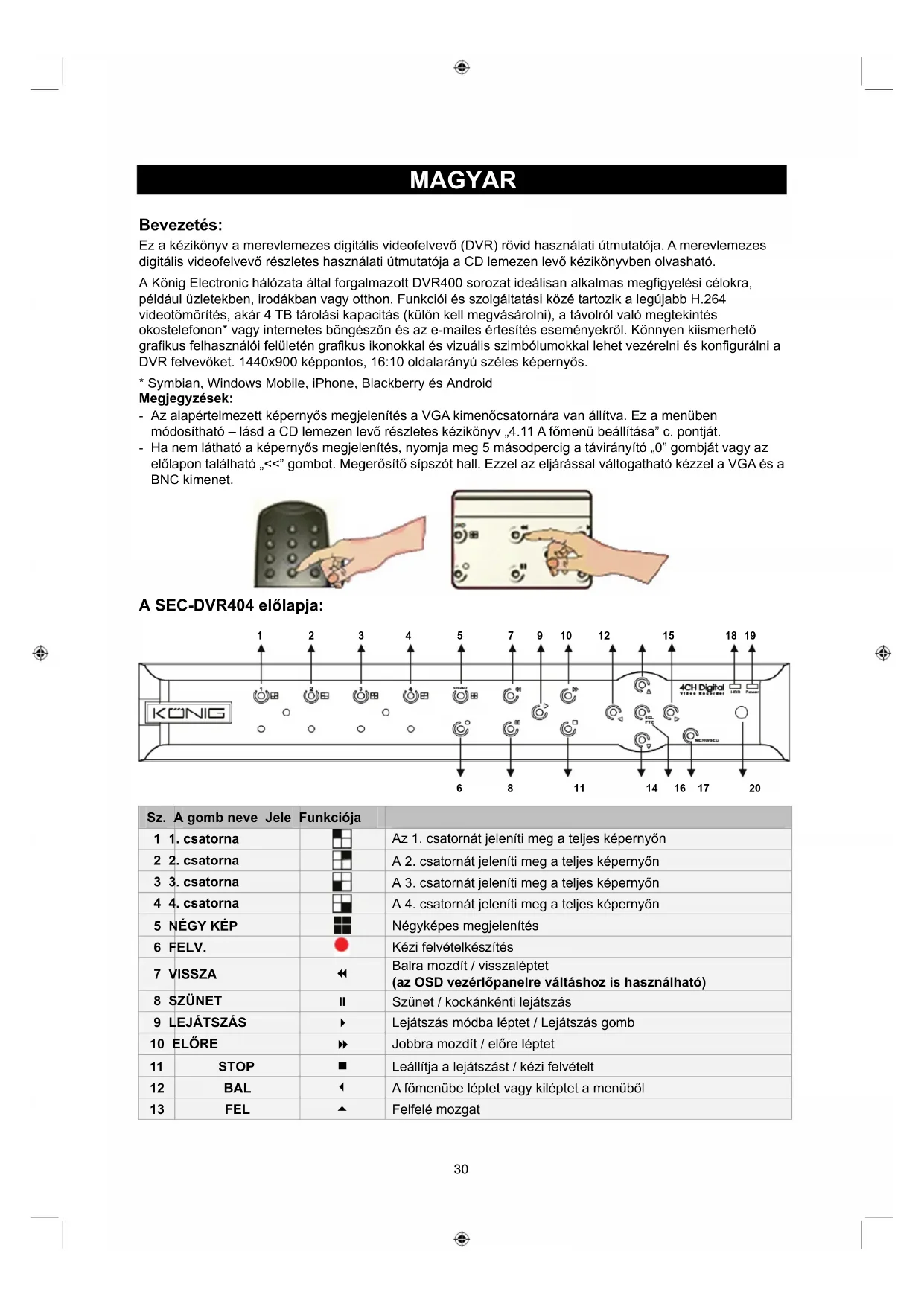- Symbian, Windows Mobile, iPhone, Blackberry és Android Megjegyzések: - Az alapértelmezett képernyős megjelenítés a VGA kimenőcsatornára van állítva. Ez a menüben módosítható – lásd a CD lemezen levő részletes kézikönyv „4.11 A főmenü beállítása” c. pontját. - Ha nem látható a képernyős megjelenítés, nyomja meg 5 másodpercig a távirányító „0” gombját vagy az előlapon található „<<” gombot. Megerősítő sípszót hall. Ezzel az eljárással váltogatható kézzel a VGA és a BNC kimenet. A SEC-DVR404 előlapja: Sz. A gomb neve Jele Funkciója 1 1. csatorna Az 1. csatornát jeleníti meg a teljes képernyőn 2 2. csatorna A 2. csatornát jeleníti meg a teljes képernyőn 3 3. csatorna A 3. csatornát jeleníti meg a teljes képernyőn 4 4. csatorna A 4. csatornát jeleníti meg a teljes képernyőn