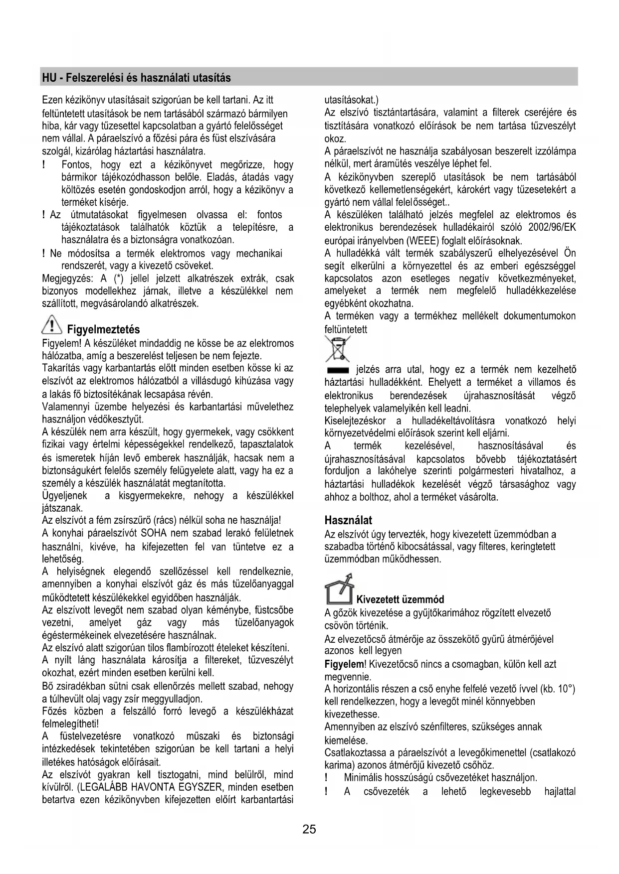 Figyelem! Az elszívó tisztán tartására, valamint a filterek