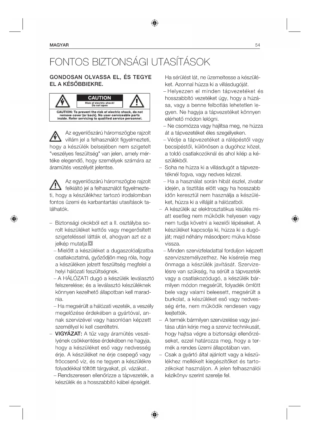 Az egyenlőszárú háromszögbe rajzolt villám jel a felhasználót figyelmezteti, hogy a készülék belsejében nem szigetelt "veszélyes feszültség" van jelen, amely mér- téke elegendő, hogy személyek számára az áramütés veszélyét jelentse. Az egyenlőszárú háromszögbe rajzolt felkiáltó jel a felhasználót figyelmezte- ti, hogy a készülékhez tartozó irodalomban fontos üzemi és karbantartási utasítások ta- lálhatók. – Biztonsági okokból ezt a II. osztályba so- rolt készüléket kettős vagy megerősített szigeteléssel látták el, ahogyan azt ez a jelkép mutatja . – Mielőtt a készüléket a dugaszolóaljzatba csatlakoztatná, győződjön meg róla, hogy a készüléken jelzett feszültség megfelel a helyi hálózati feszültségnek. – A HÁLÓZATI dugó a készülék leválasztó felszerelése; és a leválasztó készüléknek könnyen kezelhető állapotban kell marad- nia. – Ha megsérült a hálózati vezeték, a veszély megelőzése érdekében a gyártóval, an- nak szervizével vagy hasonlóan képzett személlyel ki kell cseréltetni. – VIGYÁZAT: A tűz vagy áramütés veszé- lyének csökkentése érdekében ne hagyja, hogy a készüléket eső vagy nedvesség érje. A készüléket ne érje csepegő vagy fröccsenő víz, és ne tegyen a készülékre folyadékkal töltött tárgyakat, pl. vázákat.. – Rendszeresen ellenőrizze a tápvezeték, a készülék és a hosszabbító kábel épségét.