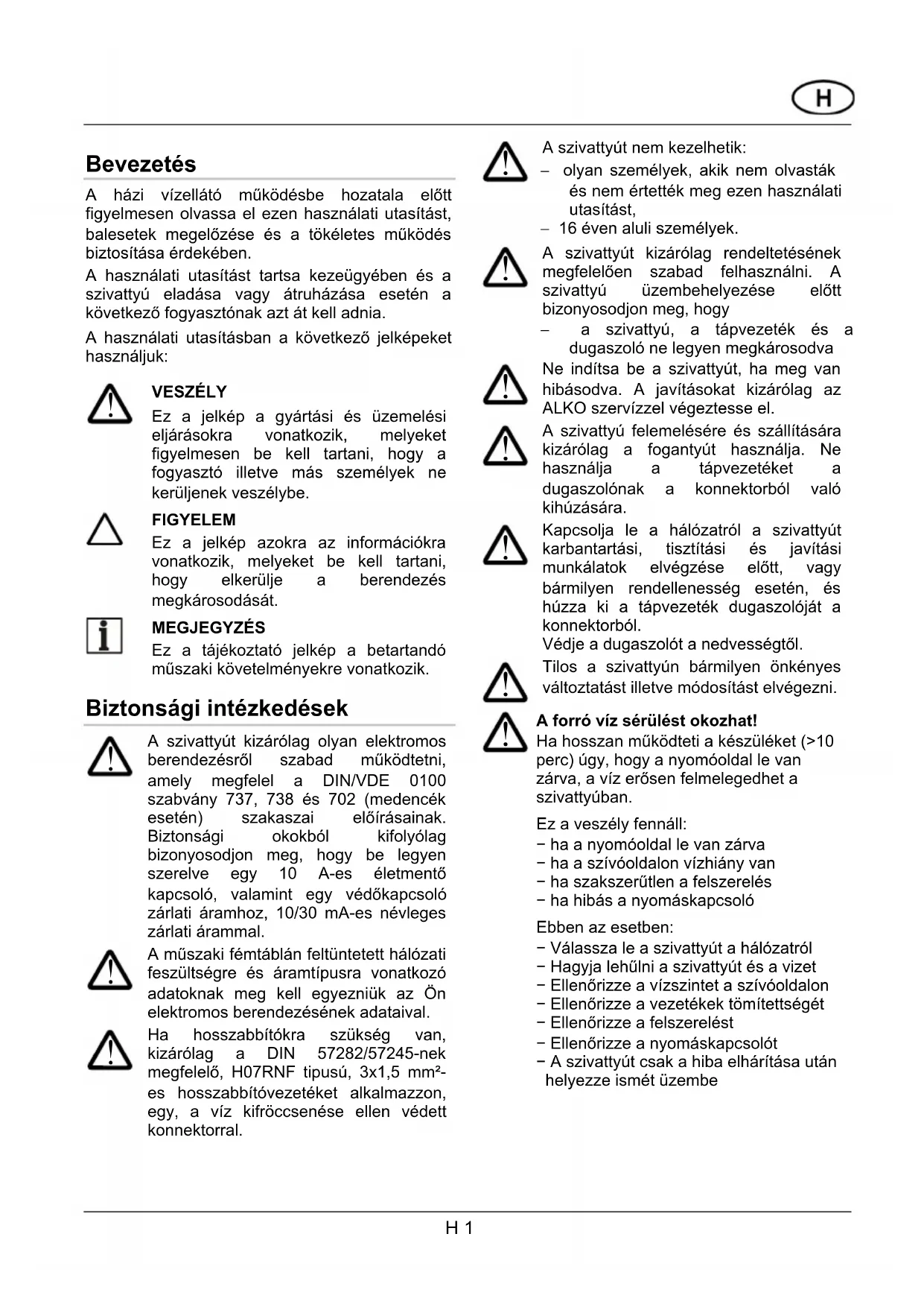 Pred akýmkoľvek zákrokom na odstránenie eventuálnych závad, vytiahnite zástrčku z elektrickej zásuvky.Bevezetés A házi vízellátó működésbe hozatala előtt figyelmesen olvassa el ezen használati utasítást, balesetek megelőzése és a tökéletes működés biztosítása érdekében. A használati utasítást tartsa kezeügyében és a szivattyú eladása vagy átruházása esetén a következő fogyasztónak azt át kell adnia. A használati utasításban a következő jelképeket használjuk: