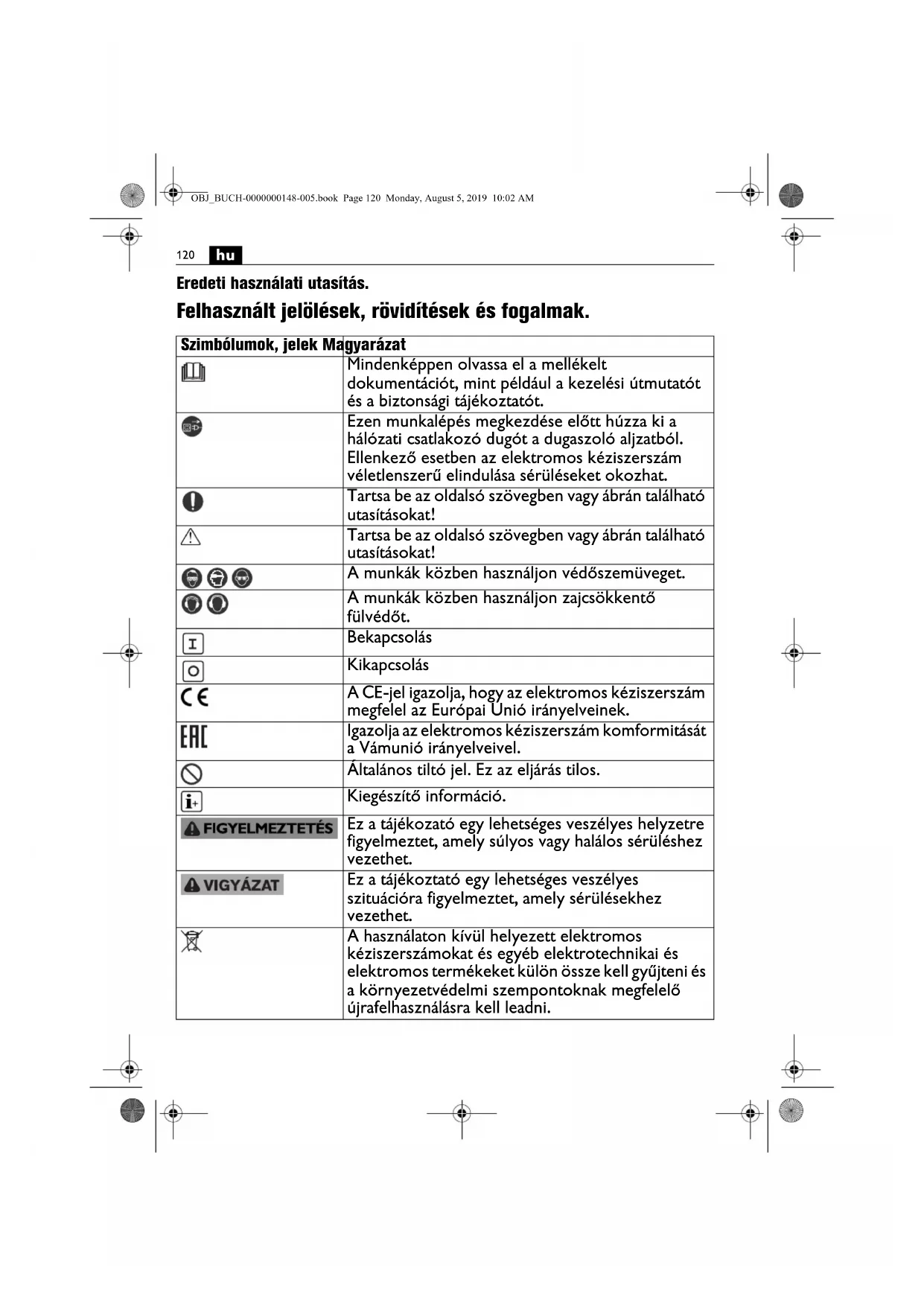 Eredeti használati utasítás. Felhasznált jelölések, rövidítések és fogalmak. Szimbólumok, jelek Magyarázat Mindenképpen olvassa el a mellékelt dokumentációt, mint például a kezelési útmutatót és a biztonsági tájékoztatót. Ezen munkalépés megkezdése előtt húzza ki a hálózati csatlakozó dugót a dugaszoló aljzatból. Ellenkező esetben az elektromos kéziszerszám véletlenszerű elindulása sérüléseket okozhat. Tartsa be az oldalsó szövegben vagy ábrán található utasításokat! Tartsa be az oldalsó szövegben vagy ábrán található utasításokat! A munkák közben használjon védőszemüveget. A munkák közben használjon zajcsökkentő fülvédőt. Bekapcsolás Kikapcsolás A CE-jel igazolja, hogy az elektromos kéziszerszám megfelel az Európai Unió irányelveinek. Igazolja az elektromos kéziszerszám komformitását a Vámunió irányelveivel. Általános tiltó jel. Ez az eljárás tilos. Kiegészítő információ. Ez a tájékozató egy lehetséges veszélyes helyzetre figyelmeztet, amely súlyos vagy halálos sérüléshez vezethet. Ez a tájékoztató egy lehetséges veszélyes szituációra figyelmeztet, amely sérülésekhez vezethet. A használaton kívül helyezett elektromos kéziszerszámokat és egyéb elektrotechnikai és elektromos termékeket külön össze kell gyűjteni és a környezetvédelmi szempontoknak megfelelő újrafelhasználásra kell leadni. OBJ_BUCH-0000000148-005.book Page 120 Monday, August 5, 2019 10:02 AM121