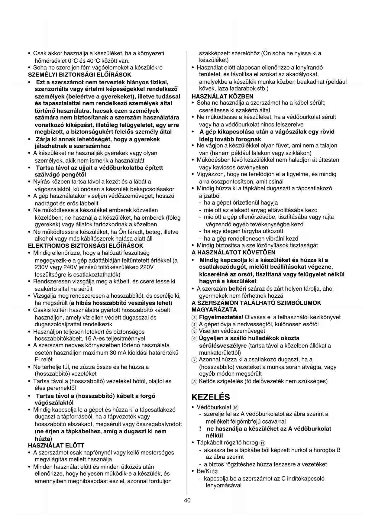 - A szerszám beltéri száraz és zárt helyen tárolja, ahol gyermekek nem férhetnek hozzá A SZERSZÁMON TALÁLHATÓ SZIMBÓLUMOK MAGYARÁZATA 3Figyelmeztetés! Olvassa el a felhasználói kézikönyvet 4 A gépet óvja a nedvességtől, különösen esőtől 5 Viseljen védőszemüveget 6 Ügyeljenaszállóhulladékokokozta sérülésveszélyre (tartsa távol a közelben állókat a munkaterülettől) 7 Azonnal húzza ki a csatlakozó dugaszt, ha a (hosszabbító) vezetéket a munka során átvágta, vagy egyéb módon megsérült 8 Kettős szigetelés (földelővezeték nem szükséges) KEZELÉS