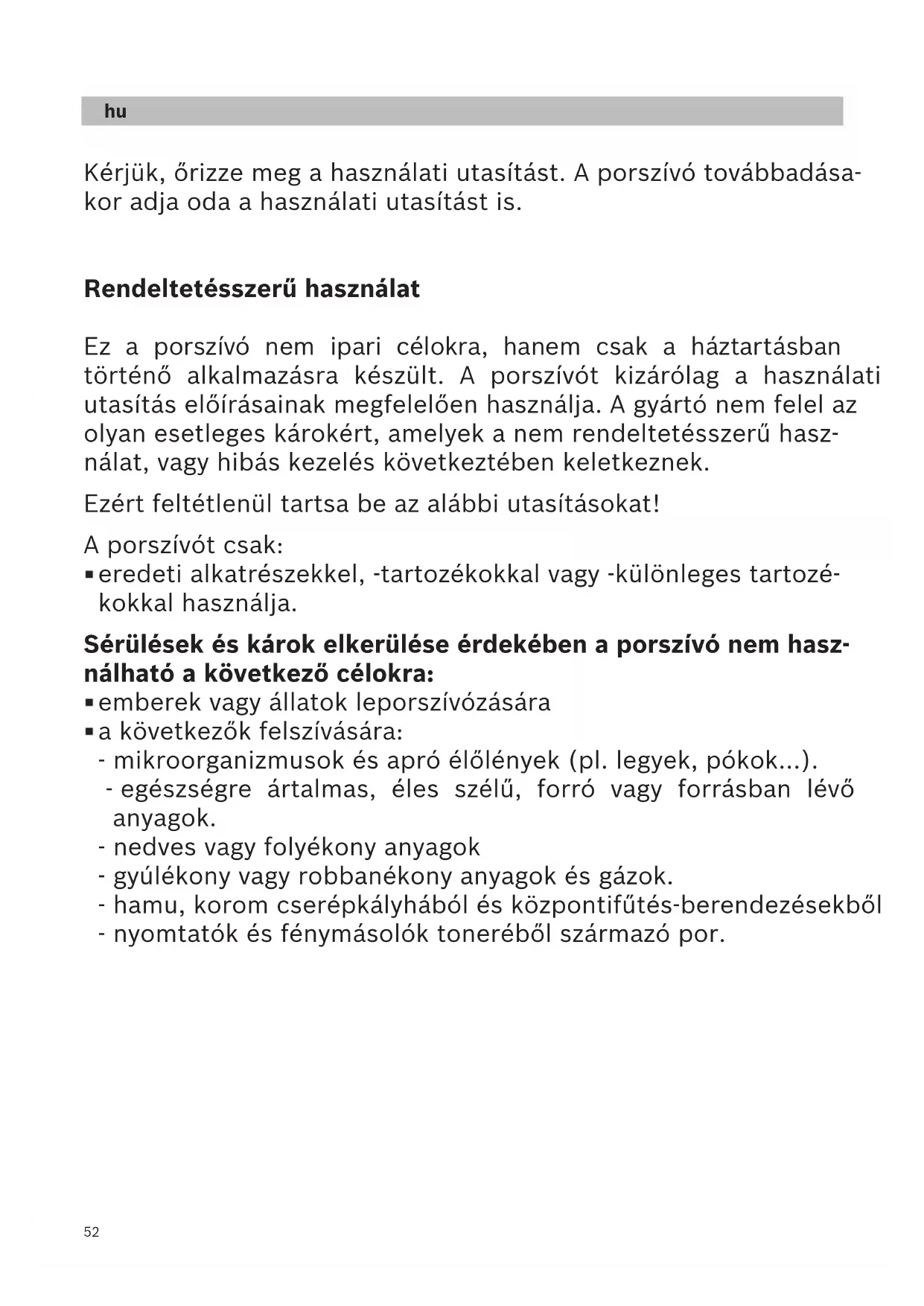 Kérjük, őrizze meg a használati utasítást. A porszívó továbbadása- kor adja oda a használati utasítást is. Rendeltetésszerű használat Ez a porszívó nem ipari célokra, hanem csak a háztartásban történő alkalmazásra készült. A porszívót kizárólag a használati utasítás előírásainak megfelelően használja. A gyártó nem felel az olyan esetleges károkért, amelyek a nem rendeltetésszerű hasz- nálat, vagy hibás kezelés következtében keletkeznek. Ezért feltétlenül tartsa be az alábbi utasításokat! A porszívót csak: eredeti alkatrészekkel, -tartozékokkal vagy -különleges tartozé- kokkal használja. Sérülések és károk elkerülése érdekében a porszívó nem hasz- nálható a következő célokra: emberek vagy állatok leporszívózására a következők felszívására: - mikroorganizmusok és apró élőlények (pl. legyek, pókok...). - egészségre ártalmas, éles szélű, forró vagy forrásban lévő anyagok. - nedves vagy folyékony anyagok - gyúlékony vagy robbanékony anyagok és gázok. - hamu, korom cserépkályhából és központifűtés-berendezésekből - nyomtatók és fénymásolók toneréből származó por.de