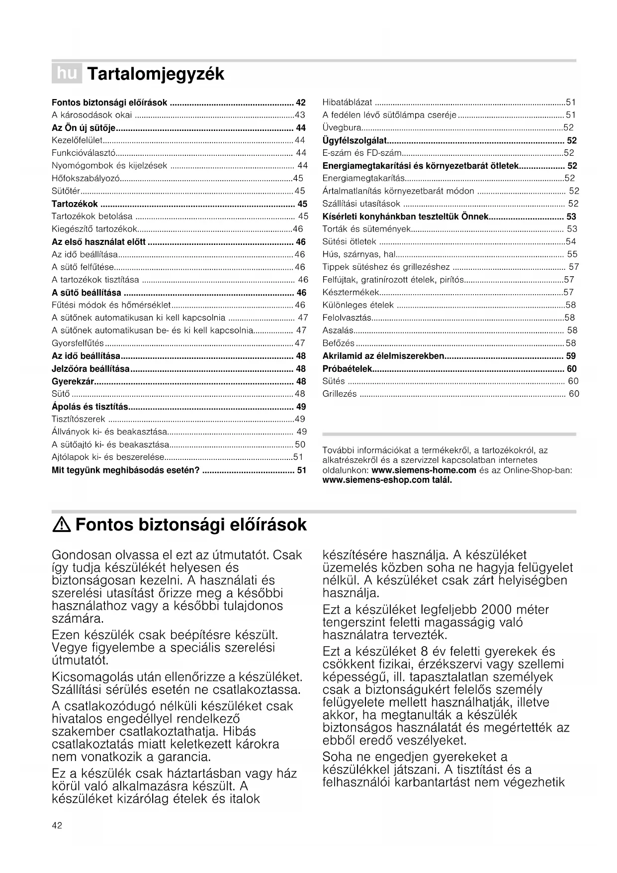 - Retournez après Z du temps de cuisson42 á Tartalomjegyzék [hu]Használati utasítás Fontos biztonsági előírások ................................................... 42 A károsodások okai ........................................................................43 Az Ön új sütője......................................................................... 44 Kezelőfelület......................................................................................44 Funkcióválasztó................................................................................ 44 Nyomógombok és kijelzések ........................................................ 44 Hőfokszabályozó..............................................................................45 Sütőtér................................................................................................45 Tartozékok ................................................................................ 45 Tartozékok betolása ........................................................................ 45 Kiegészítő tartozékok......................................................................46 Az első használat előtt ............................................................ 46 Az idő beállítása............................................................................... 46 A sütő felfűtése.................................................................................46 A tartozékok tisztítása ..................................................................... 46 A sütő beállítása ...................................................................... 46 Fűtési módok és hőmérséklet....................................................... 46 A sütőnek automatikusan ki kell kapcsolnia .............................. 47 A sütőnek automatikusan be- és ki kell kapcsolnia.................. 47 Gyorsfelfűtés.....................................................................................47 Az idő beállítása....................................................................... 48 Jelzőóra beállítása................................................................... 48 Gyerekzár.................................................................................. 48 Sütő ....................................................................................................48 Ápolás és tisztítás.................................................................... 49 Tisztítószerek ....................................................................................49 Állványok ki és beakasztása......................................................... 49 A sütőajtó ki és beakasztása........................................................ 50 Ajtólapok ki- és beszerelése..........................................................51 Mit tegyünk meghibásodás esetén? ...................................... 51 Hibatáblázat ......................................................................................51 A fedélen lévő sütőlámpa cseréje ................................................ 51 Üvegbura...........................................................................................52 Ügyfélszolgálat......................................................................... 52 E-szám és FD-szám.........................................................................52 Energiamegtakarítási és környezetbarát ötletek................... 52 Energiamegtakarítás........................................................................52 Ártalmatlanítás környezetbarát módon ........................................ 52 Szállítási utasítások ......................................................................... 52 Kísérleti konyhánkban teszteltük Önnek............................... 53 Torták és sütemények..................................................................... 53 Sütési ötletek ....................................................................................54 Hús, szárnyas, hal............................................................................ 55 Tippek sütéshez és grillezéshez ................................................... 57 Felfújtak, gratinírozott ételek, pirítós.............................................57 Késztermékek...................................................................................57 Különleges ételek ............................................................................58 Felolvasztás.......................................................................................58 Aszalás............................................................................................... 58 Befőzés ..............................................................................................58 Akrilamid az élelmiszerekben................................................. 59 Próbaételek............................................................................... 60 Sütés .................................................................................................. 60 Grillezés ............................................................................................. 60 Produktinfo További információkat a termékekről, a tartozékokról, az alkatrészekről és a szervizzel kapcsolatban internetes oldalunkon: www.siemens-home.com és az Online-Shop-ban: www.siemens-eshop.com talál. : Fontos biztonsági előírások Gondosan olvassa el ezt az útmutatót. Csak így tudja készülékét helyesen és biztonságosan kezelni. A használati és szerelési utasítást őrizze meg a későbbi használathoz vagy a későbbi tulajdonos számára. Ezen készülék csak beépítésre készült. Vegye figyelembe a speciális szerelési útmutatót. Kicsomagolás után ellenőrizze a készüléket. Szállítási sérülés esetén ne csatlakoztassa. A csatlakozódugó nélk