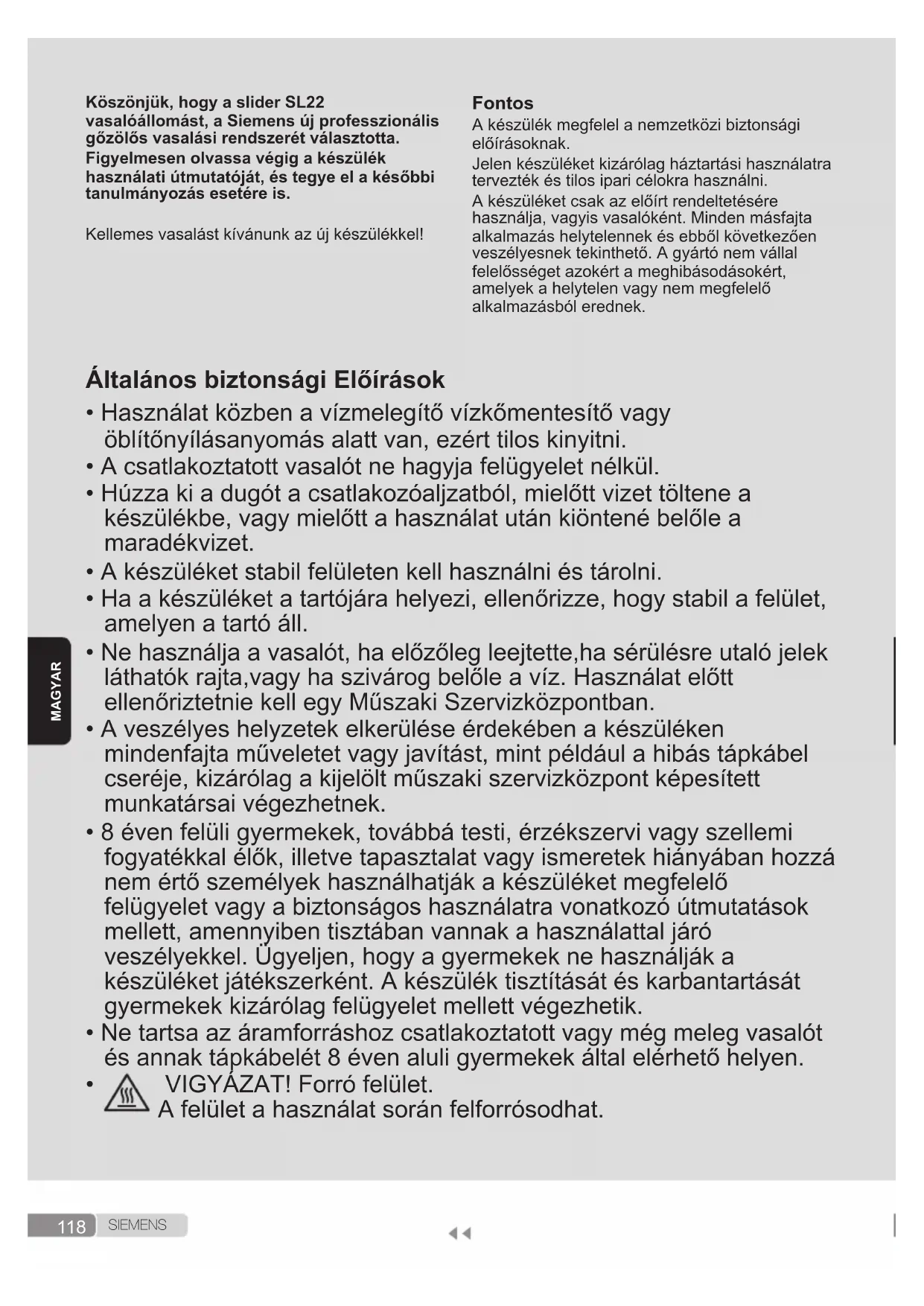 • A csatlakoztatott vasalót ne hagyja felügyelet nélkül.