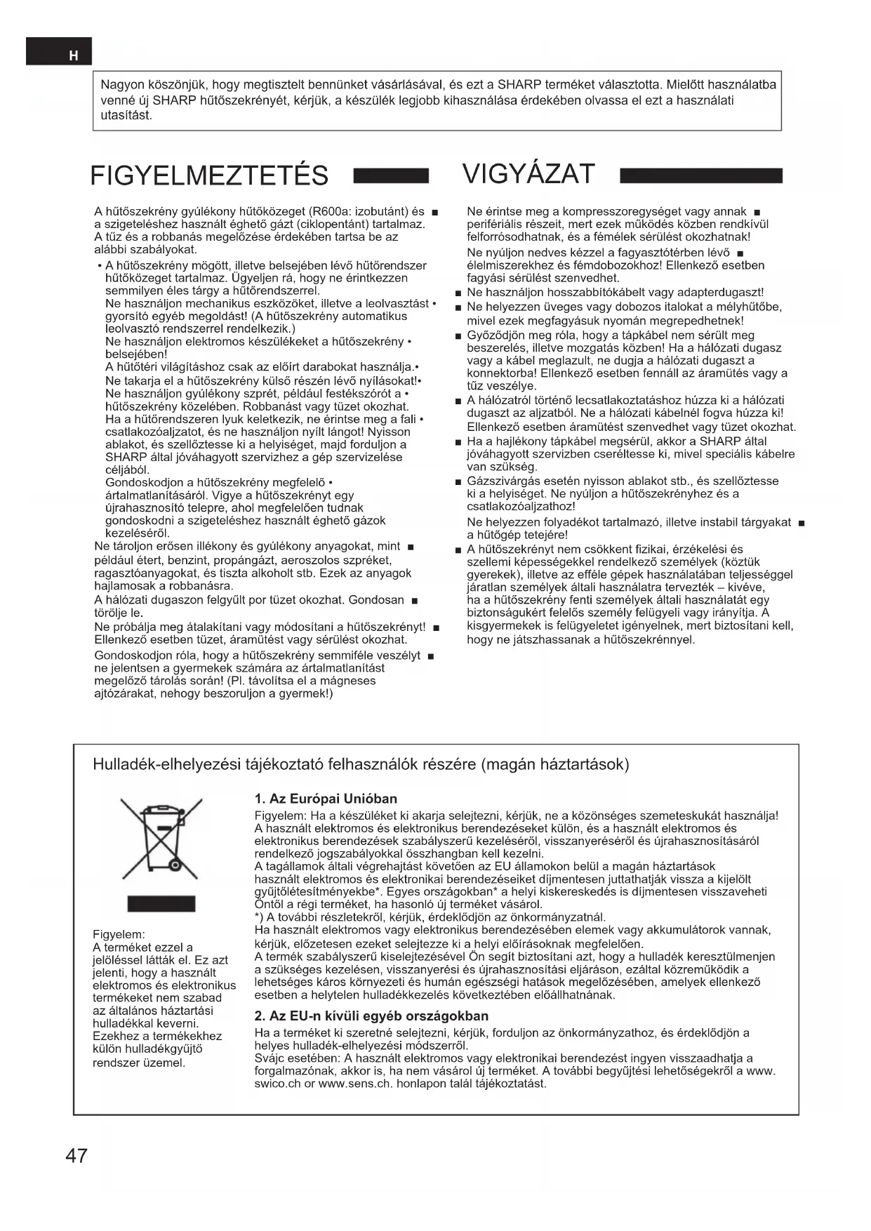 Ne helyezzen üveges vagy dobozos italokat a mélyhűtőbe, ■ mivel ezek megfagyásuk nyomán megrepedhetnek! Győződjön meg róla, hogy a tápkábel nem sérült meg ■ beszerelés, illetve mozgatás közben! Ha a hálózati dugasz vagy a kábel meglazult, ne dugja a hálózati dugaszt a konnektorba! Ellenkező esetben fennáll az áramütés vagy a tűz veszélye. A hálózatról történő lecsatlakoztatáshoz húzza ki a hálózati ■ dugaszt az aljzatból. Ne a hálózati kábelnél fogva húzza ki! Ellenkező esetben áramütést szenvedhet vagy tüzet okozhat. Ha a hajlékony tápkábel megsérül, akkor a SHARP által ■ jóváhagyott szervizben cseréltesse ki, mivel speciális kábelre van szükség. Gázszivárgás esetén nyisson ablakot stb., és szellőztesse ■ ki a helyiséget. Ne nyúljon a hűtőszekrényhez és a csatlakozóaljzathoz!Ne helyezzen folyadékot tartalmazó, illetve instabil tárgyakat ■a hűtőgép tetejére! A hűtőszekrényt nem csökkent fizikai, érzékelési és ■ szellemi képességekkel rendelkező személyek (köztük gyerekek), illetve az efféle gépek használatában teljességgel járatlan személyek általi használatra tervezték – kivéve, ha a hűtőszekrény fenti személyek általi használatát egy biztonságukért felelős személy felügyeli vagy irányítja. A kisgyermekek is felügyeletet igényelnek, mert biztosítani kell, hogy ne játszhassanak a hűtőszekrénnyel. Hulladék-elhelyezési tájékoztató felhasználók részére (magán háztartások)
