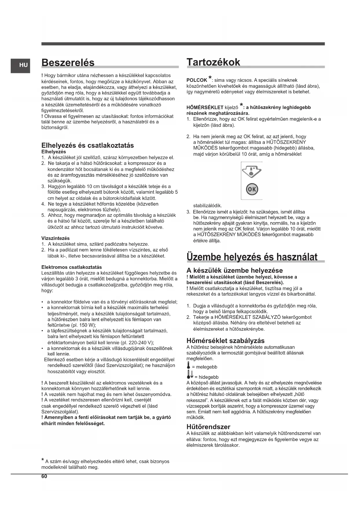 POLCOK *: sima vagy rácsos. A speciális síneknek köszönhetően kivehetőek és magasságuk állítható (lásd ábra), így nagyméretű edényeket vagy élelmiszereket is betehet.HŐMÉRSÉKLET kijelző *: a hűtőszekrény leghidegebb részének meghatározására.1. Ellenőrizze, hogy az OK felirat egyértelműen megjelenik-e a kijelzőn (lásd ábra).2. Ha nem jelenik meg az OK felirat, az azt jelenti, hogy a hőmérséklet túl magas: állítsa a HŰTŐSZEKRÉNY MŰKÖDÉS tekerőgombot magasabb (hidegebb) állásba, majd várjon körülbelül 10 órát, amíg a hőmérséklet stabilizálódik.3. Ellenőrizze ismét a kijelzőt: ha szükséges, ismét állítsa be. Ha nagymennyiségű élelmiszert helyezett be, vagy a hűtőszekrény ajtaját gyakran kinyitja, normális, ha a kijelzőn nem jelenik meg az OK felirat. Várjon legalább 10 órát, mielőtt a HŰTŐSZEKRÉNY MŰKÖDÉS tekerőgombot magasabb értékre állítja. Üzembe helyezés és használat